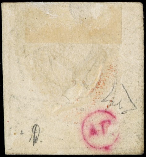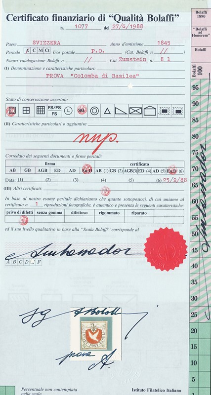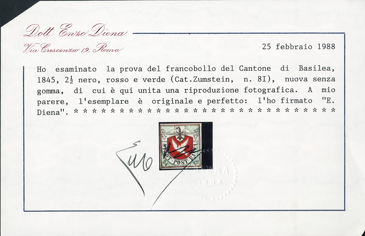 1845 - BASILEA: Saggio 'Colombina' 2 1/2Rp nero, verde e vermiglio. CF E.Diena e finanziario Bolaffi (Zumstein 8/I - CHF 8.750)