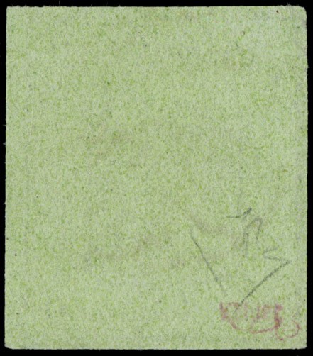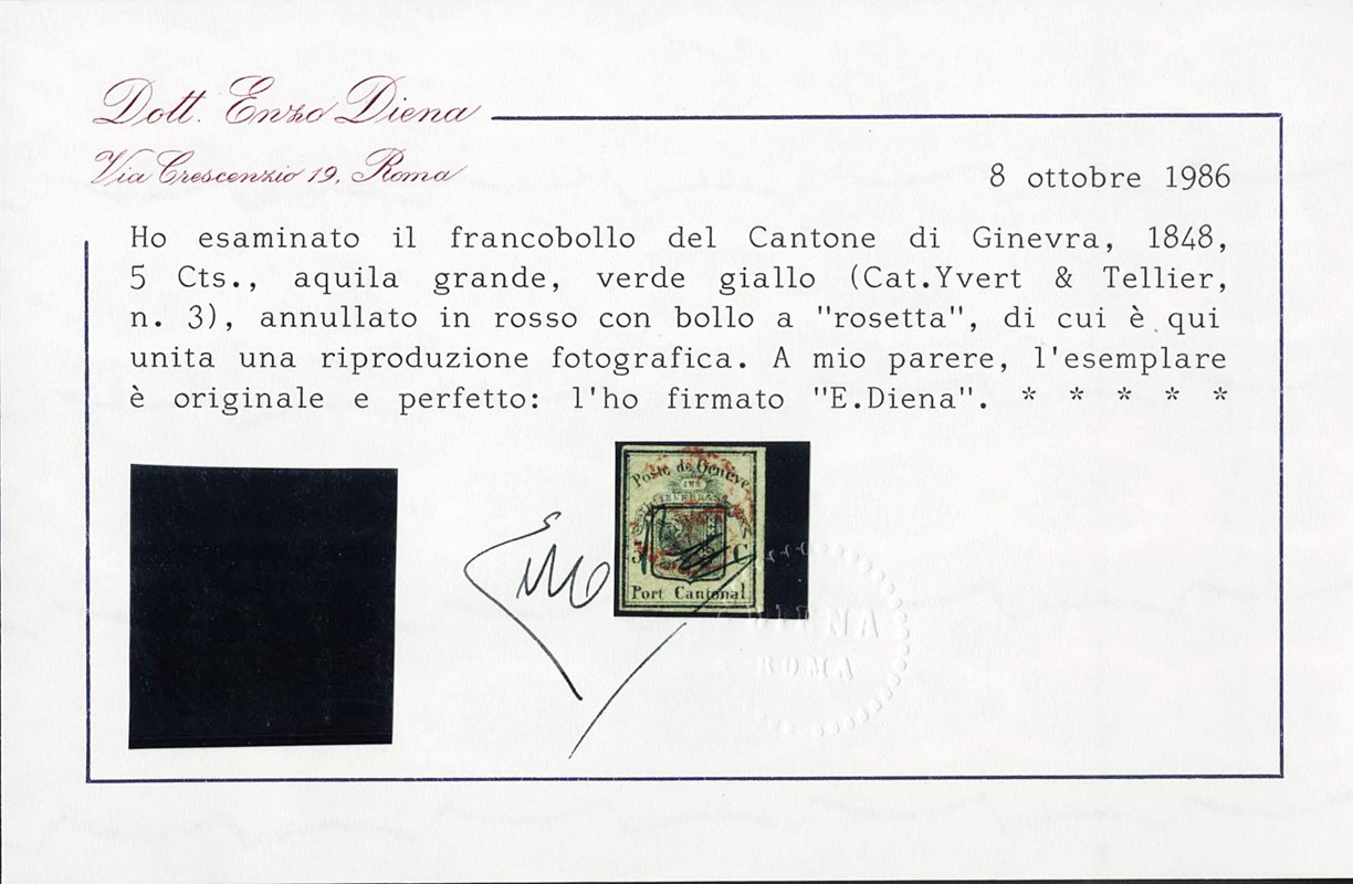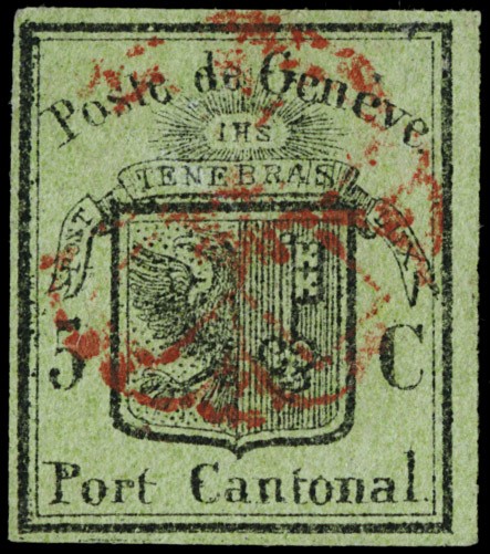 1845 - GINEVRA: 5c nero su verde aquila grande, grandi margini, annullato rosetta rossa. CF E.Diena (Zumstein 6 - CHF 2.300)