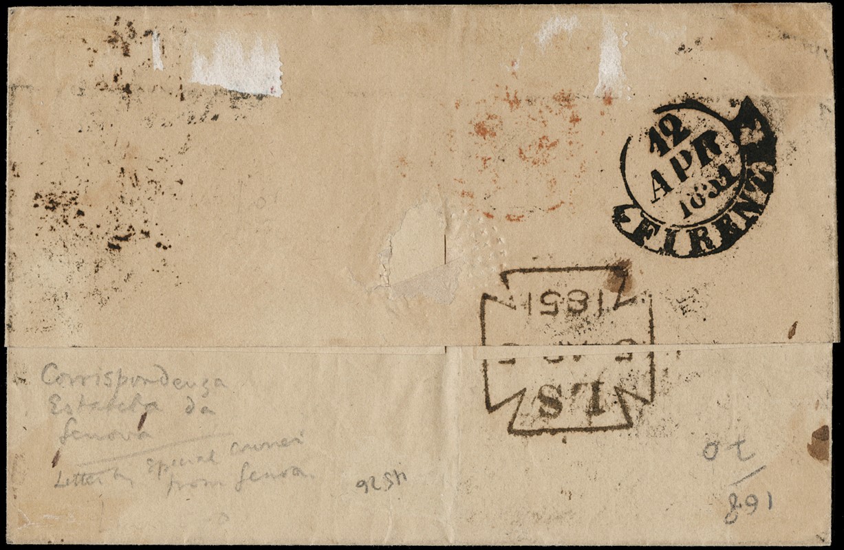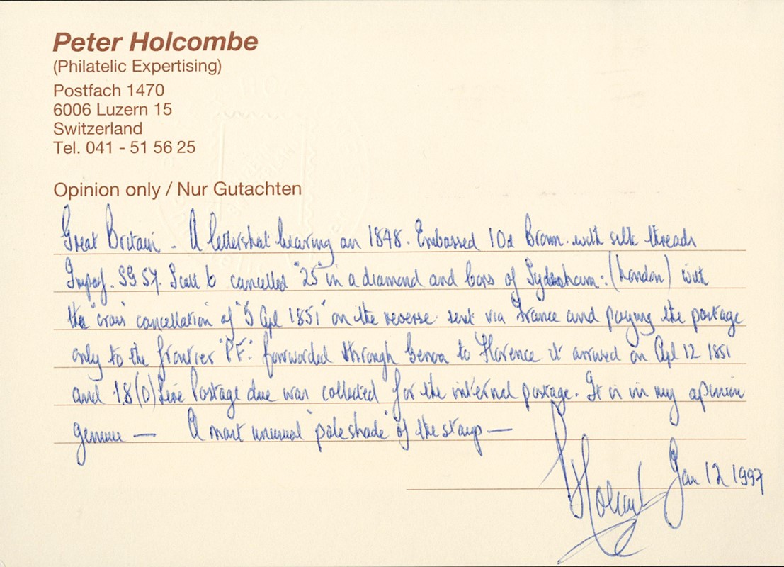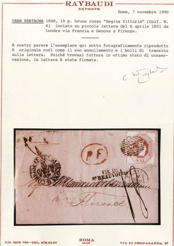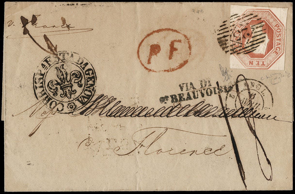 1848 - Gran Bretagna: Regina Vittoria 10d bruno rosso embossed, annullato numerale '25', da Londra il 5 aprile 1851 a Firenze, via Francia e Genova. Al recto diversi interessanti bolli di transito, tra cui 'PF' in ovale rosso, 'VIA DI BEAUVOISIN' lineare nero, 'CORRISP EST DA GENOVA' in doppio cerchio nero con giglio al centro. CF Raybaudi e Holcombe (SG 57 - GBP 3.200)