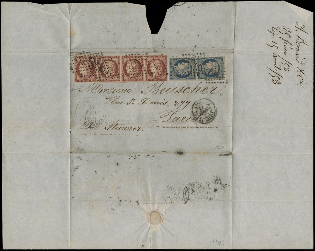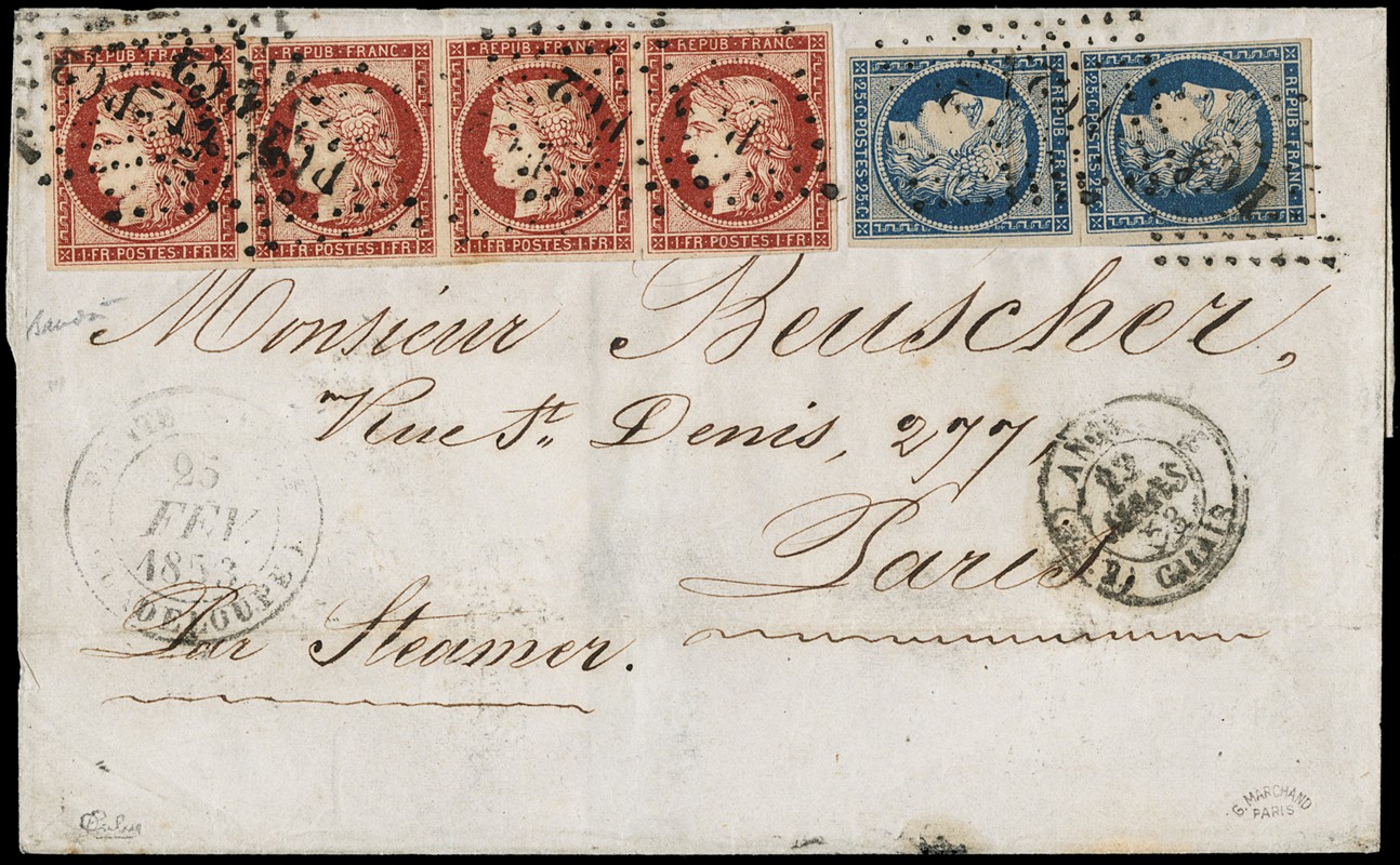1849 - GUADALUPA: Francia Ceres 25c azzurro, coppia, e 1fr carminio chiaro ST4, tutti con ottimi margini su tutti i lati, su lettera da tre porti da 'POINTE A PITRE - GUADELOUPE 25 FEV. 1853' a Parigi. Splendida, timbrini Calvez e Marchand (Yvert 4+6 - Euro - )