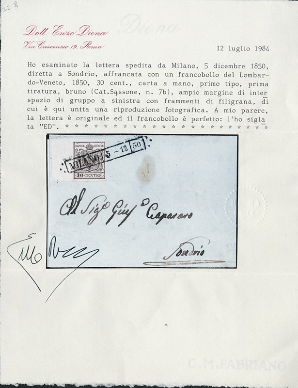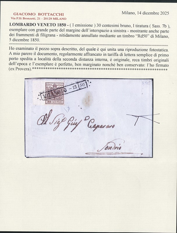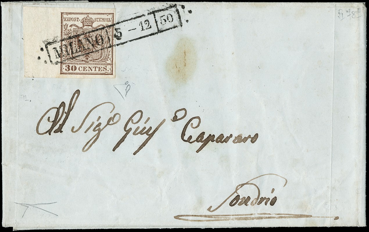 1850 – 30c bruno, I tir. carta a mano, con grande BdF a sinistra 12mm e frammenti di filigrana, da 'MILANO 5 DICEMBRE 1850' a Sondrio. Splendida. CF Bottacchi ed E.Diena (Sassone 7b - Euro - )
