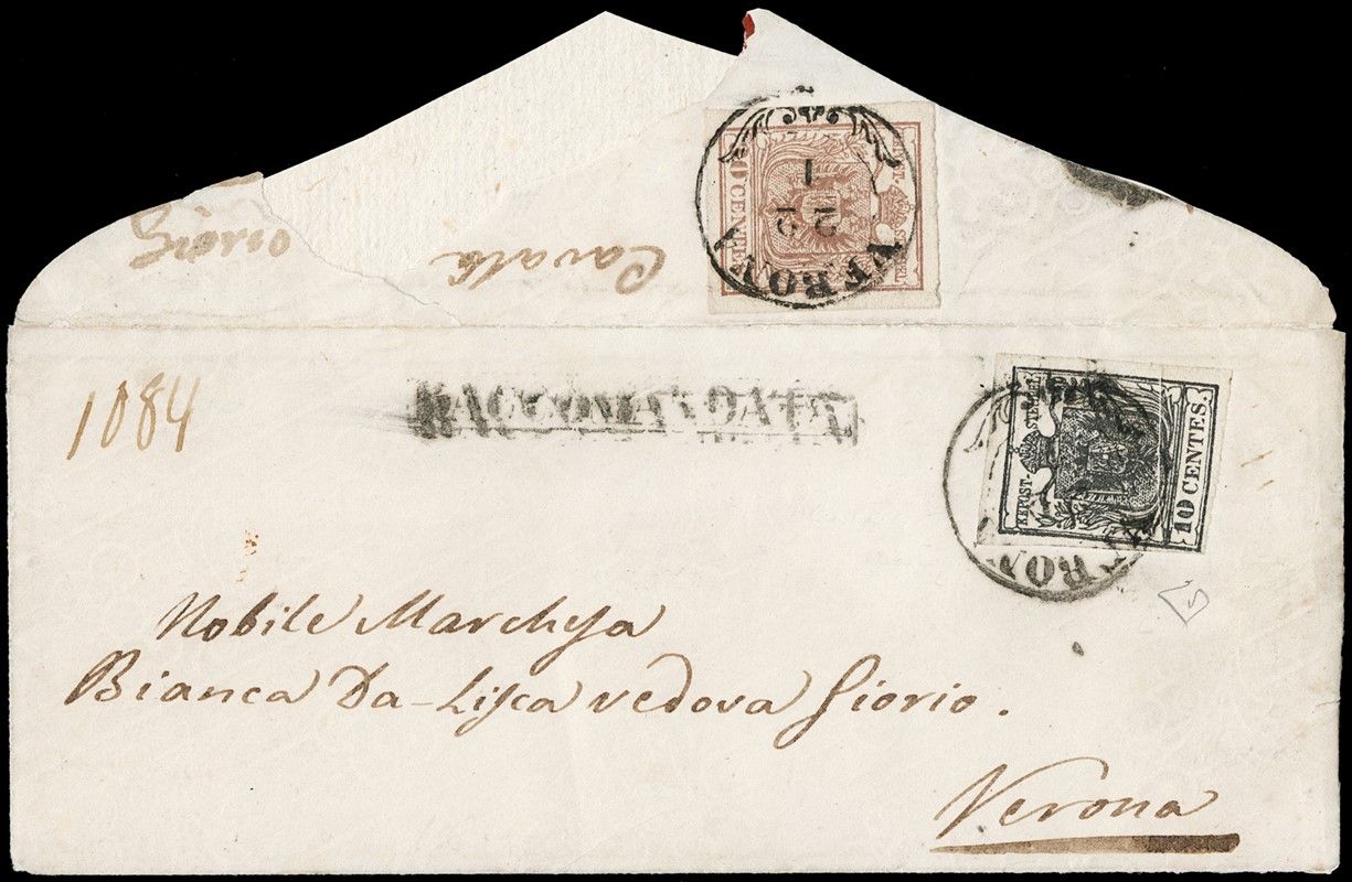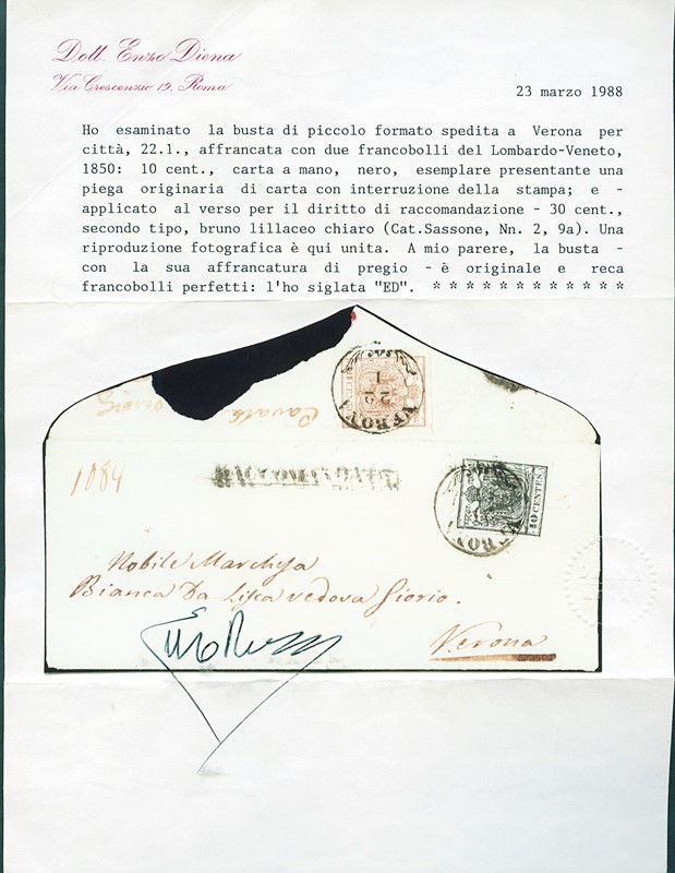 1850 - 10c nero carbone, con piega 'accordeon' e, al verso, 30c bruno lillaceo chiaro, II tipo, su 'RACCOMANDATA' da 'VERONA 22/1' 1854 per citta'. Rara raccomandata in tariffa ridotta per citta' a 30 centesimi, valida per pochissimo tempo. CF E.Diena (Sassone 2e+9a - Euro - )