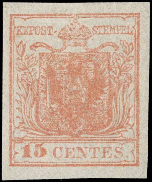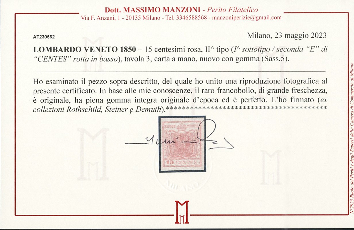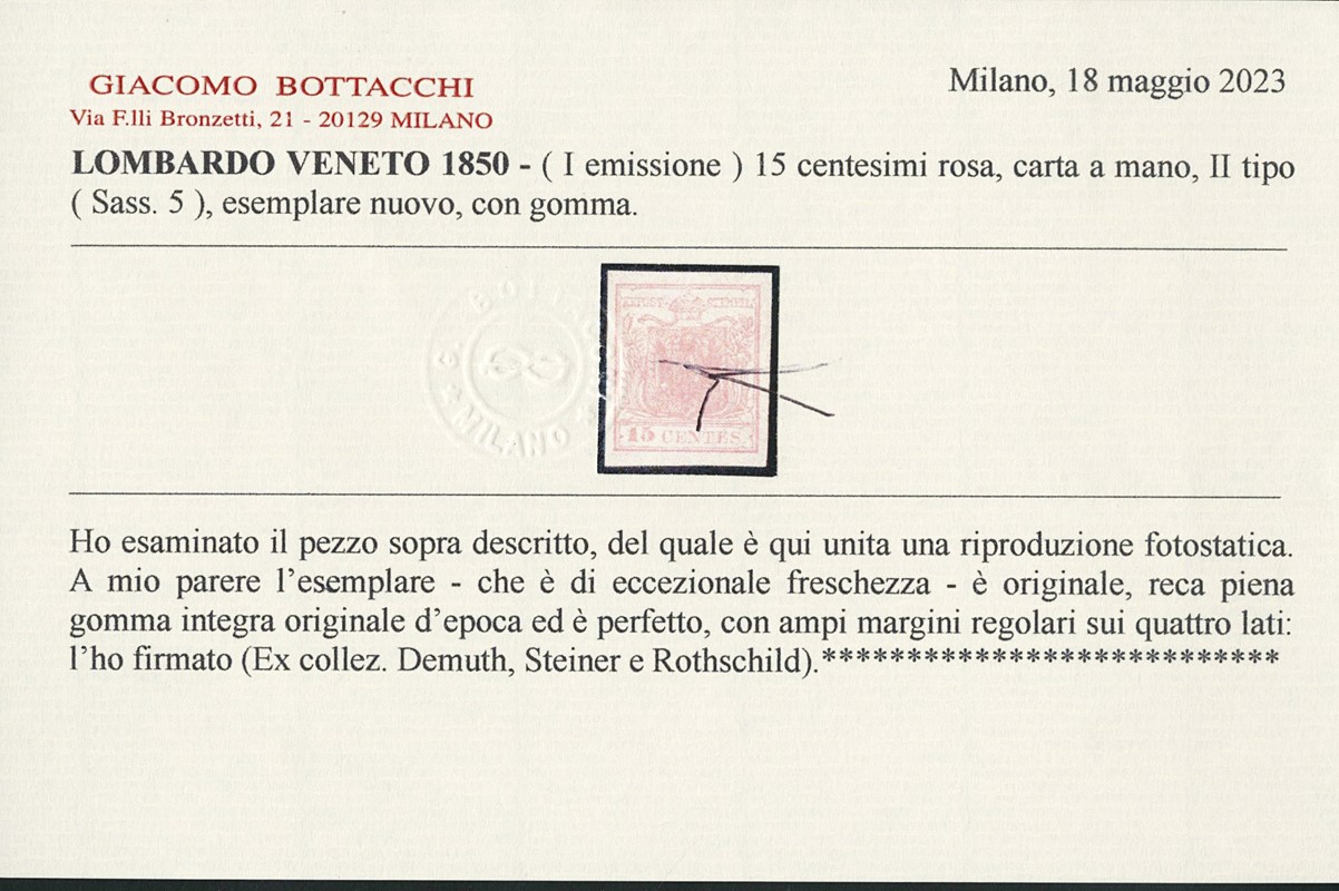 1850 - 15c rosa, II tipo, III tav (I sottotipo - 'E' rotta in basso), SL. Ex collezioni Rothschild, Steiner e Demuth. Firma Ferchenbauer, CF Bottacchi e Manzoni (Sassone 5 sott.I - Euro 21.000)
