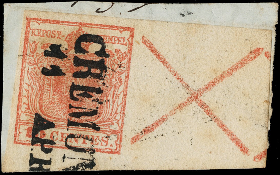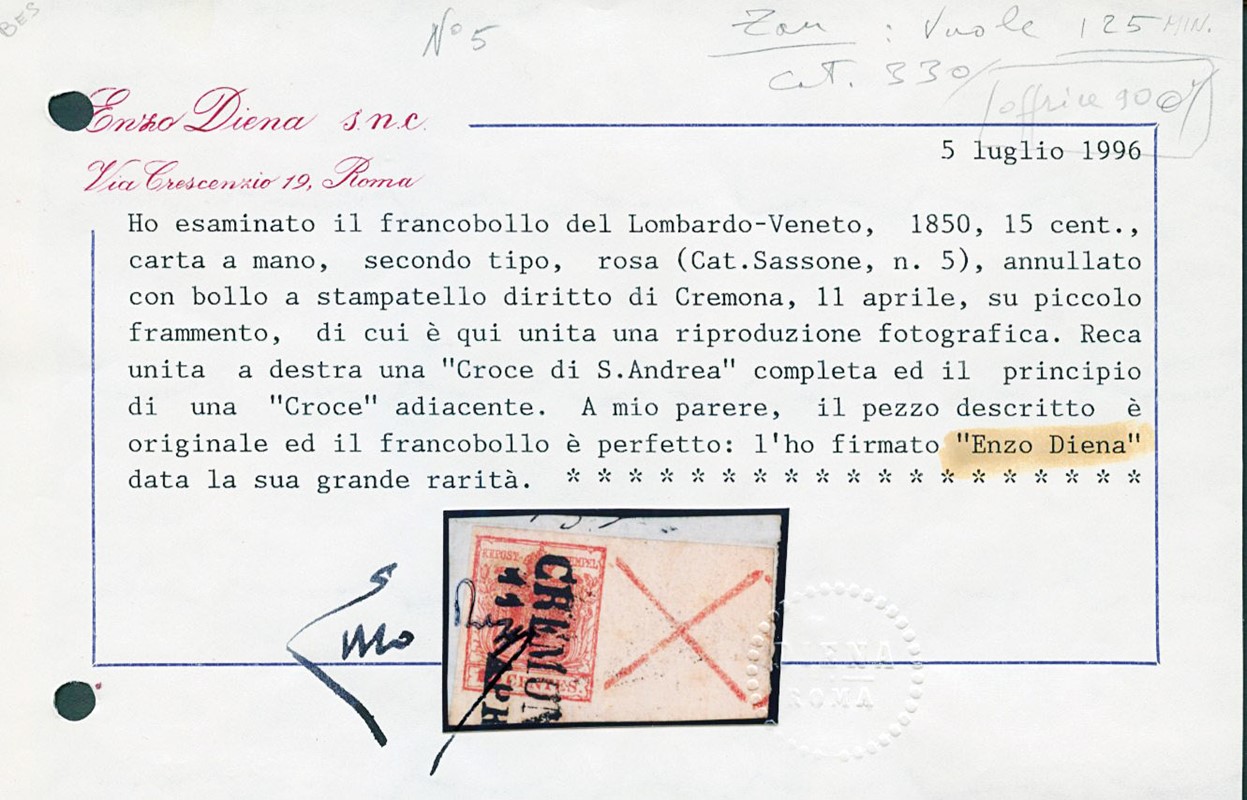 1850 - 15c rosa III tav., BdF destro con croce di S.Andrea completa e parte di un'altra, annullato 'CREMONA 11 APR'. CF E.Diena (Sassone 5 - Euro 150.000++)