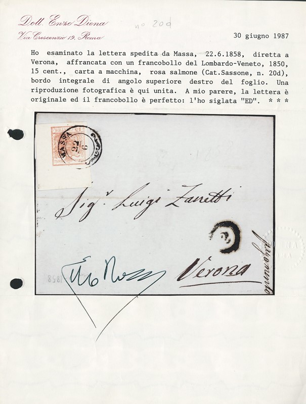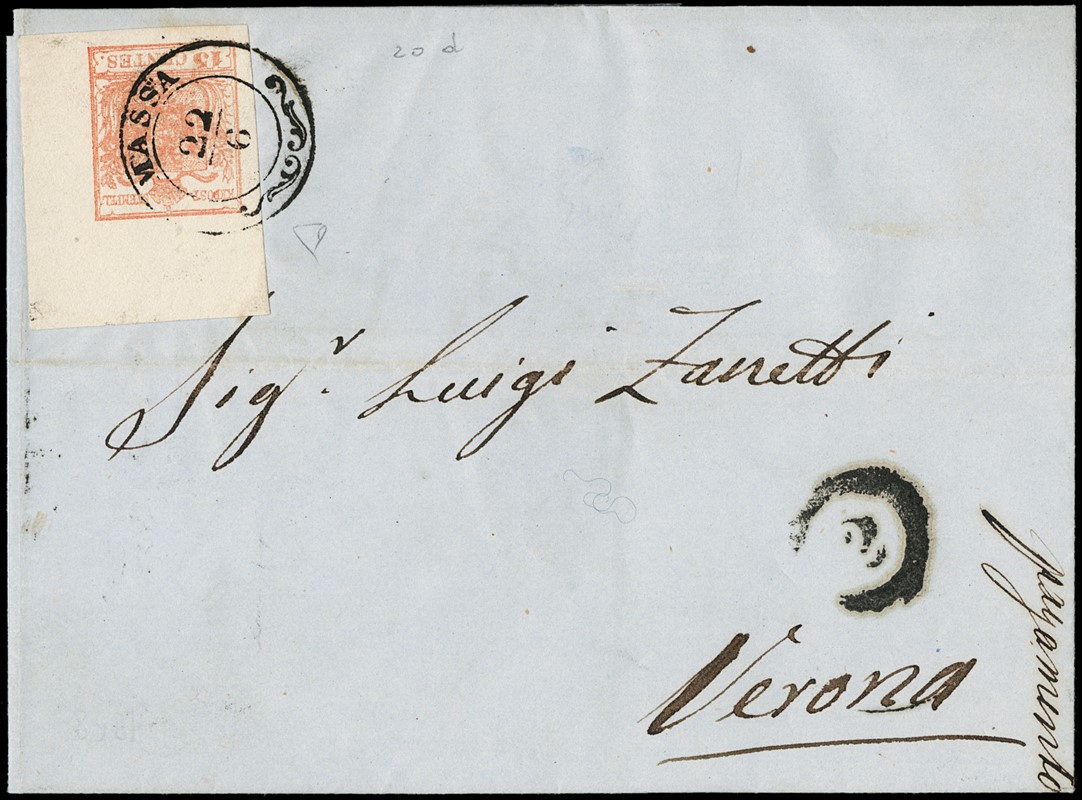 1850 - 15c rosa salmone carta a macchina AdF superiore destro 8x13mm da 'MASSA 22/6' a Verona. CF E.Diena (Sassone 20d - Euro -)