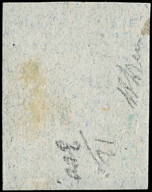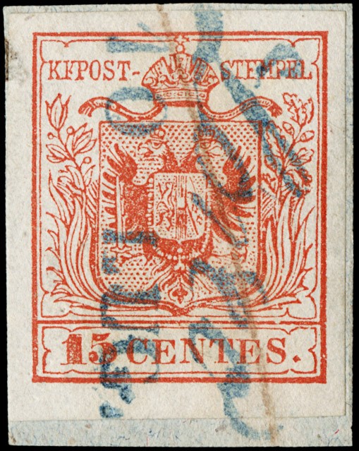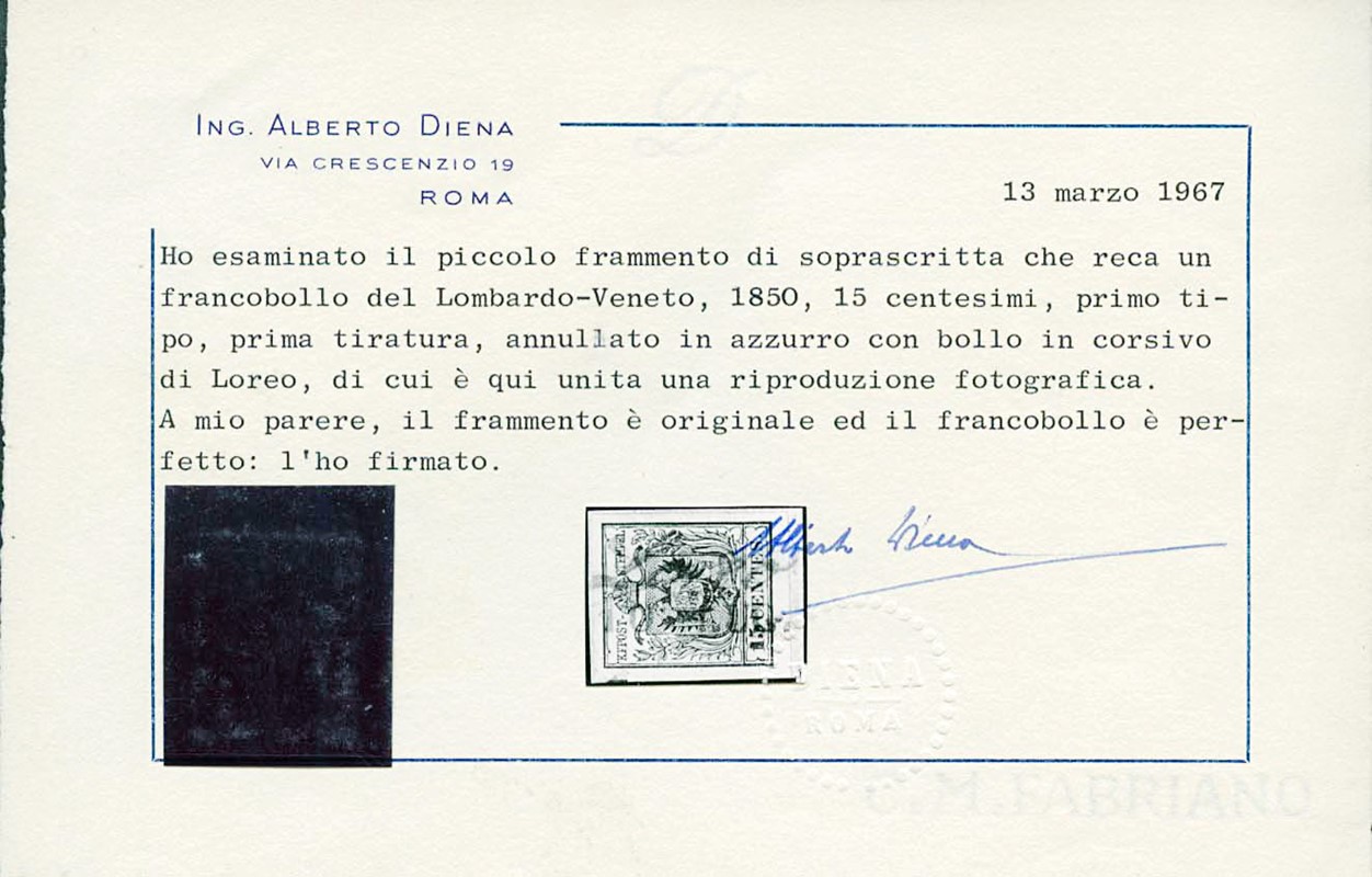 1850 - 15c rosso, I tipo I tir., annullato 'LOREO 10 LUG.' con bollo corsivo azzurro, su piccolo frammento. Splendido e raro. CF A.Diena (Sassone 3a+pt.R3 - Euro 12.000)