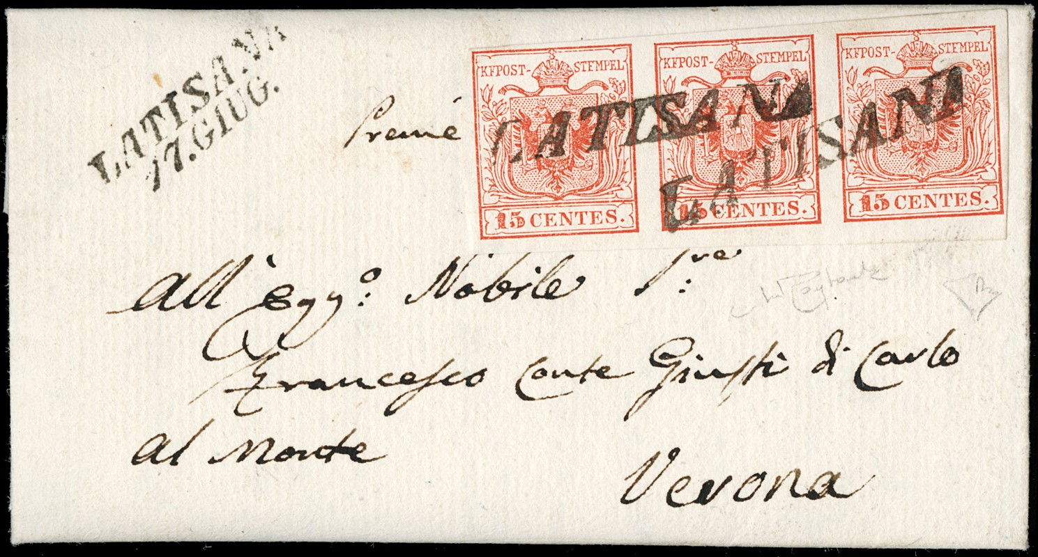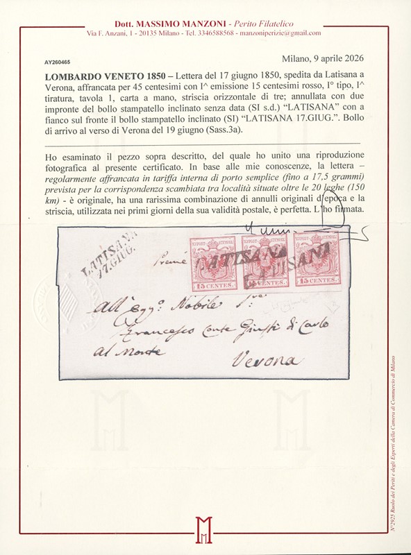 1850 - 15c rosso I tir. ST3 da 'LATISANA 17. GIUG.' (SI s.d. annullatore e SI sulla soprascritta). Splendida lettera di piccolo formato 'presse'' per Verona. Firme Raybaudi ed E.Diena, CF Manzoni (Sassone 3a+pt.R3 - Euro 64.000)