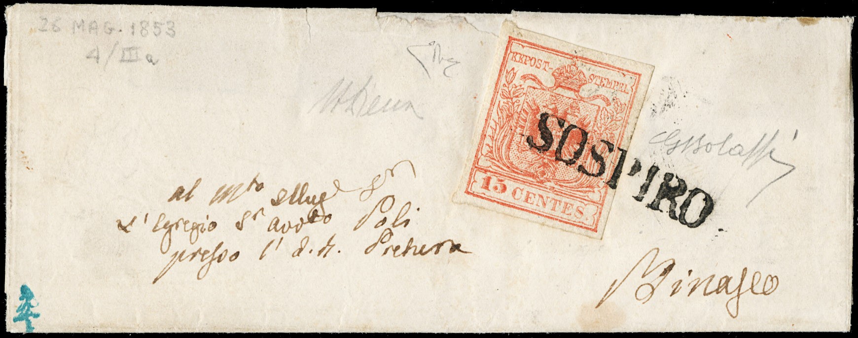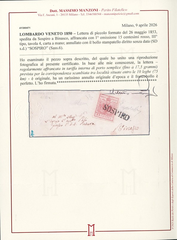 1850 - 15c rosso III tipo da 'SOSPIRO' SD s.d. a Binasco (26 maggio 1853) su piccolissima lettera femminile. Ex collezione Provera, firme Giulio Bolaffi, A. ed E.Diena, CF Manzoni (Sassone 6+pt.R1 - Euro 22.500)