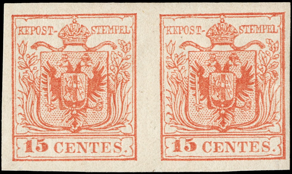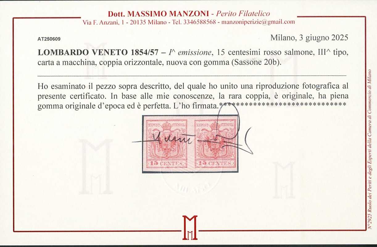 1850 - 15c rosso salmone carta a macchina, coppia. Sigle A. ed E.Diena, firma Giulio Bolaffi, CF Manzoni (Sassone 20b - Euro 9.000+)