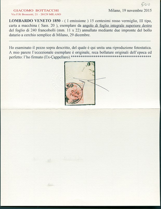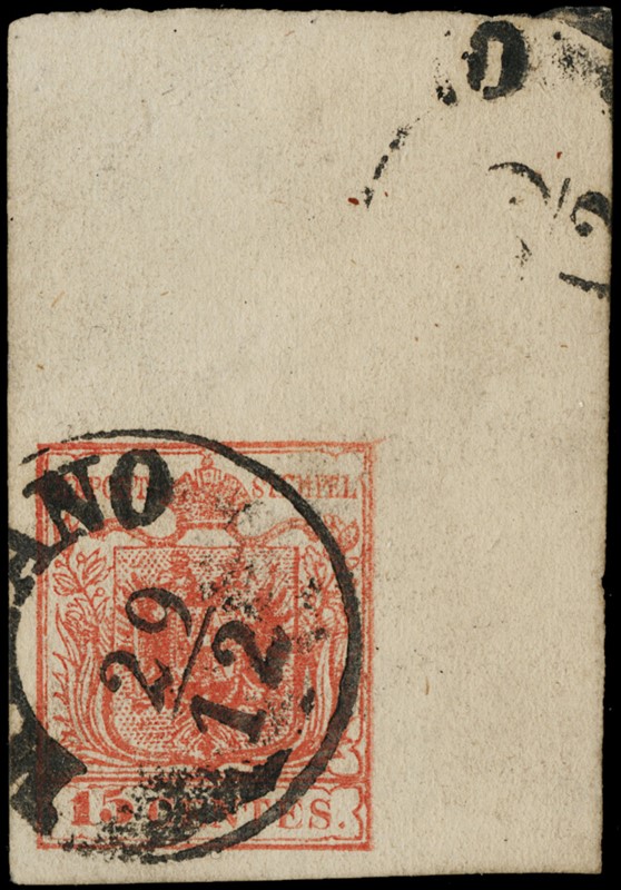 1850 - 15c rosso vermiglio, carta a macchina, AdF superiore destro integrale, 11x22mm, annullato 'MILANO 29/18', ripetuto sull'angolo. Eccezionale, CF Bottacchi ed E.Diena (Sassone 20 - Euro - )