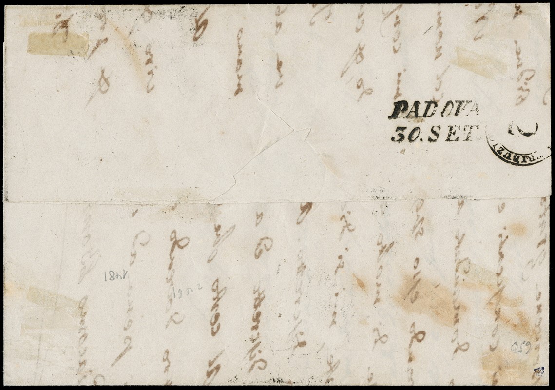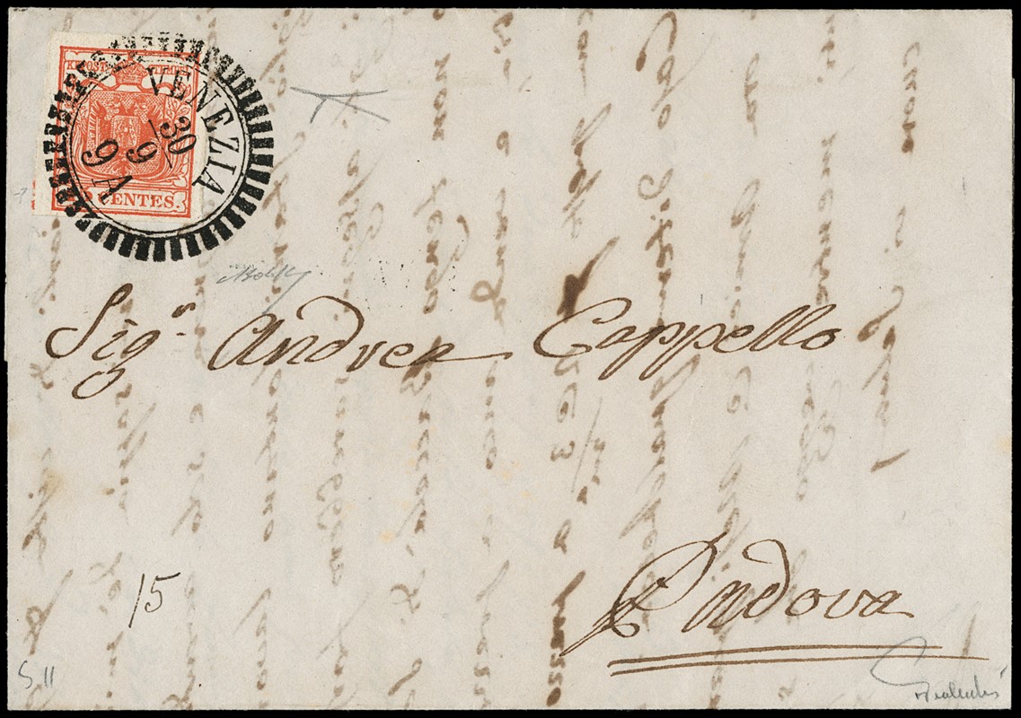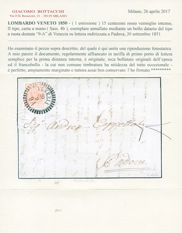 1850 - 15c rosso vermiglio, II tipo II tav., da 'VENEZIA 30/9 9A' (ruota dentata), per Padova. Firma Bolaffi e CF Bottacchi (Sassone 4b+pt.12 - Euro 9.500)