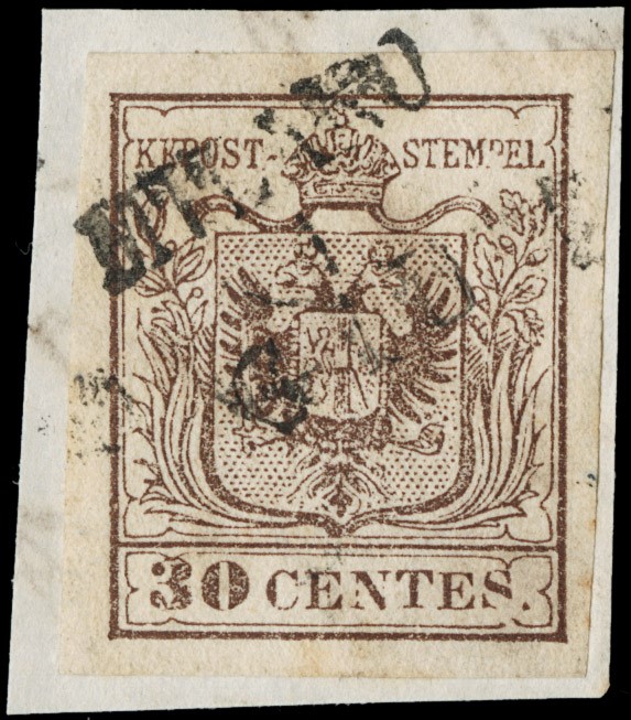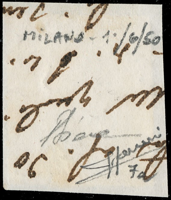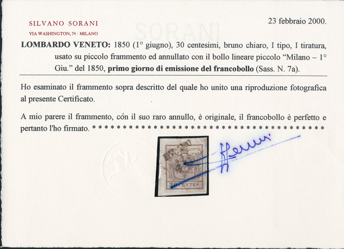 1850 - 30c bruno chiaro, I tipo I tir., annullato 'MILANO 1 GIU' (SD piccolo su tre righe) su frammento. Primo giorno d'uso dei francobolli di Lombardo Veneto. CF Sorani (Sassone 7a - Euro 12.500)