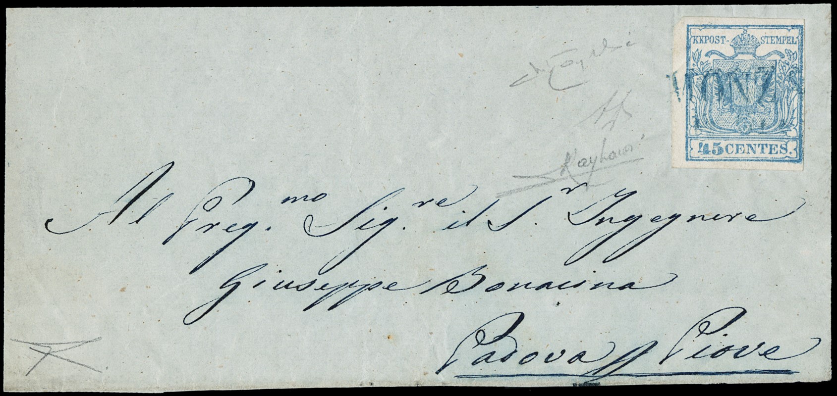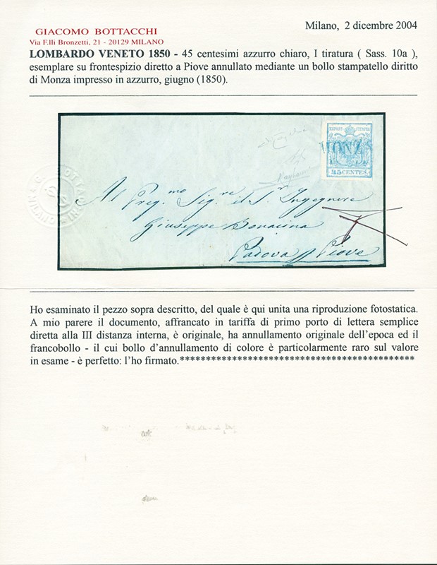 1850 - 45c azzurro chiaro, I tipo I tir., su frontespizio di lettera da 'MONZA', SD azzurro, per Piove. Splendida combinazione. Firme A.Diena e Raybaudi, CF Bottacchi (Sassone 10a+pt.R1 - Euro 22.500/2=11.250++)