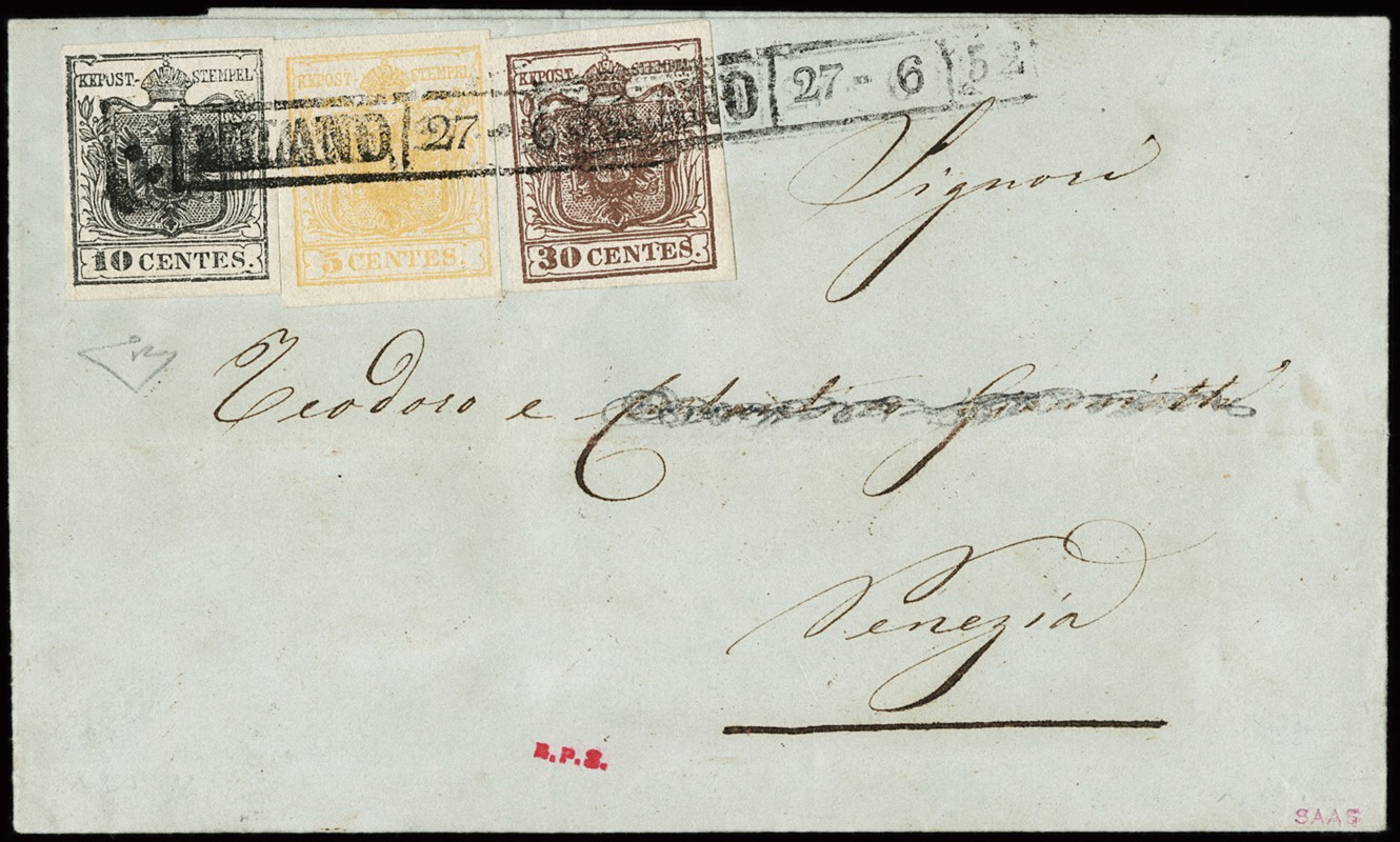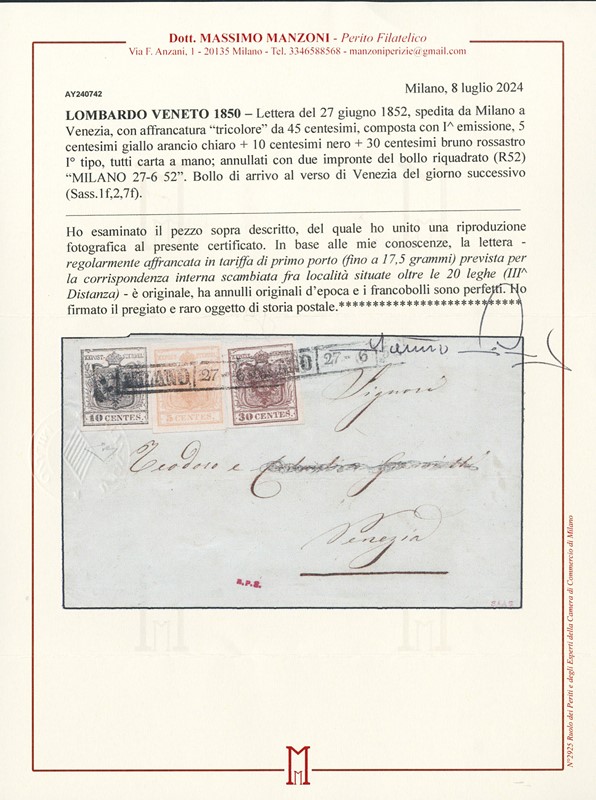 1850 - 5c giallo arancio, 10c nero e 30c bruno rossastro I tipo da 'MILANO | 27 - 6 | 52' a Venezia. Firma E.Diena, CF Manzoni (Sassone 1g+2+7f - Euro 25.000)