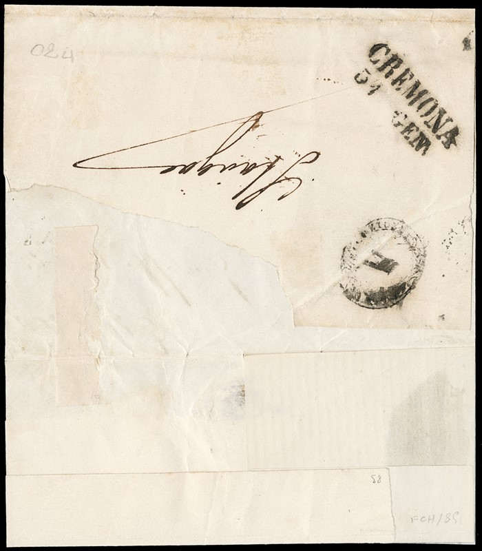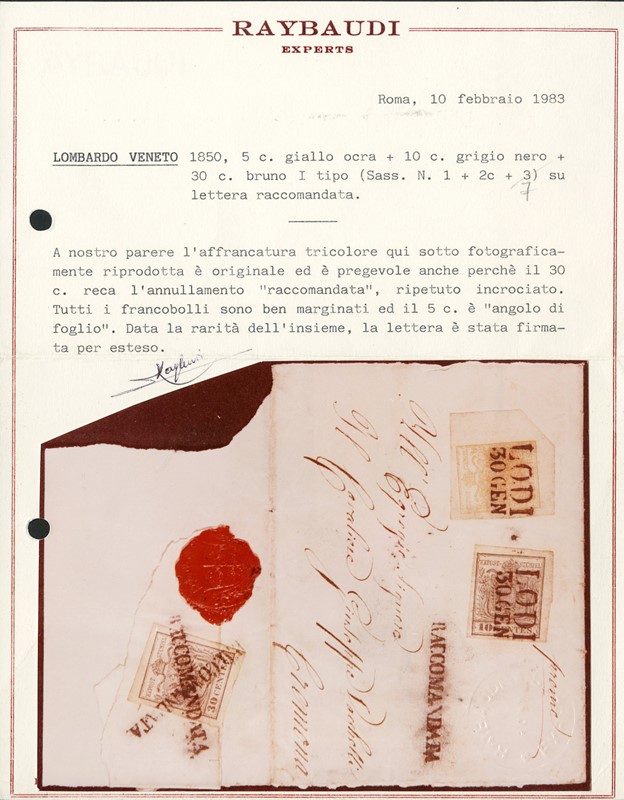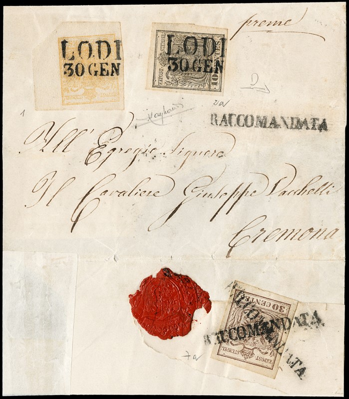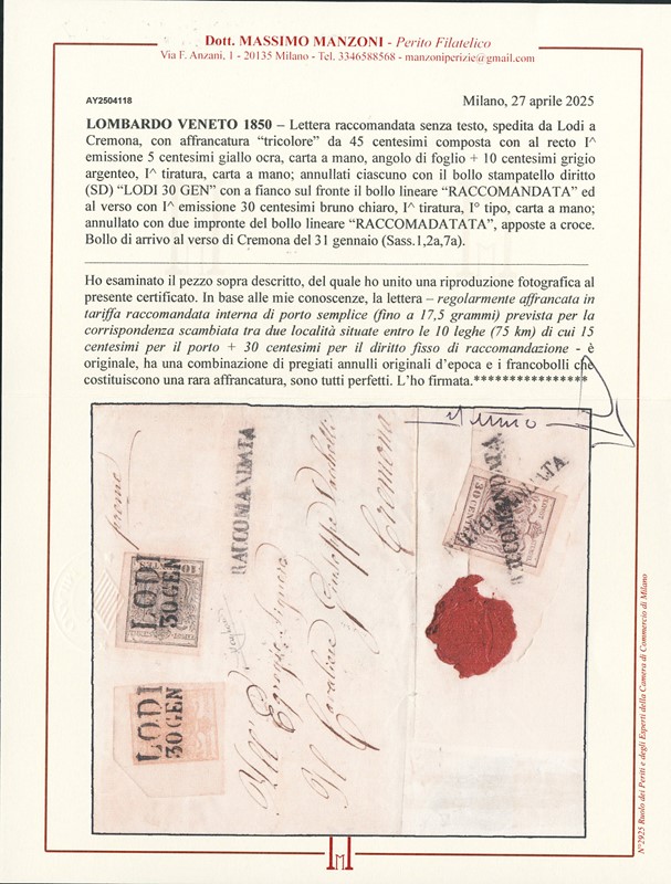 1850 - 5c giallo ocra AdF, 10c grigio argenteo I tir. e 30c bruno chiaro I tipo I tir., su 'RACCOMANDATA' da 'LODI 30 GEN' a Cremona. Lettera priva delle sguardiole laterali. CF Manzoni e Raybaudi (Sassone 1+2a+7a+pt.9 - Euro 10.350++)