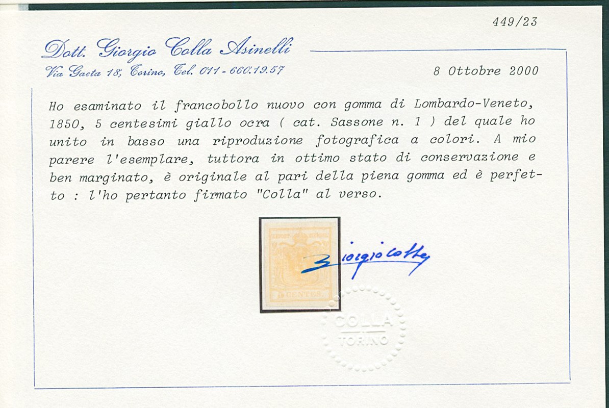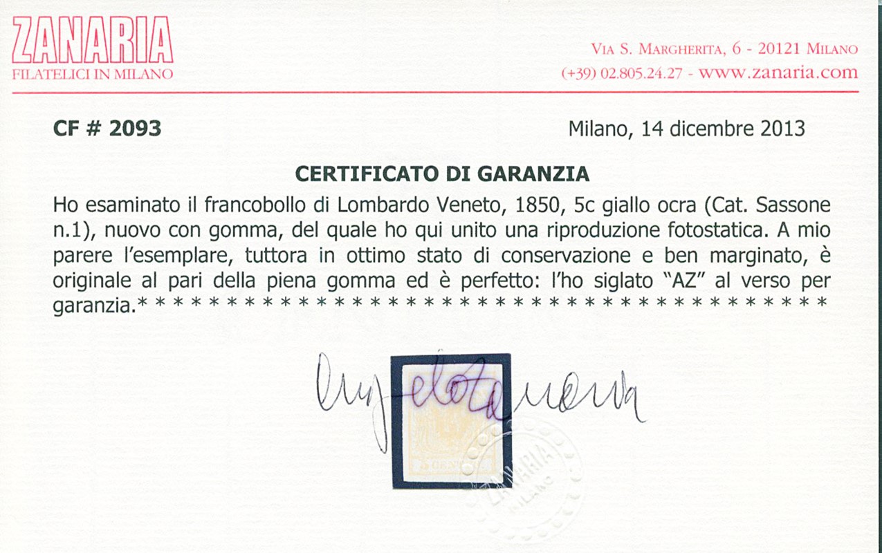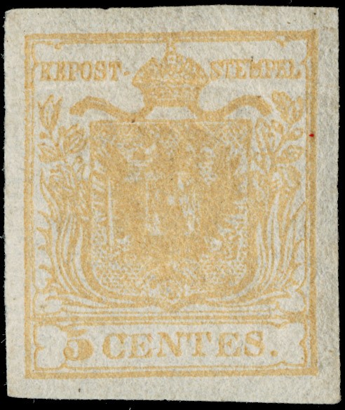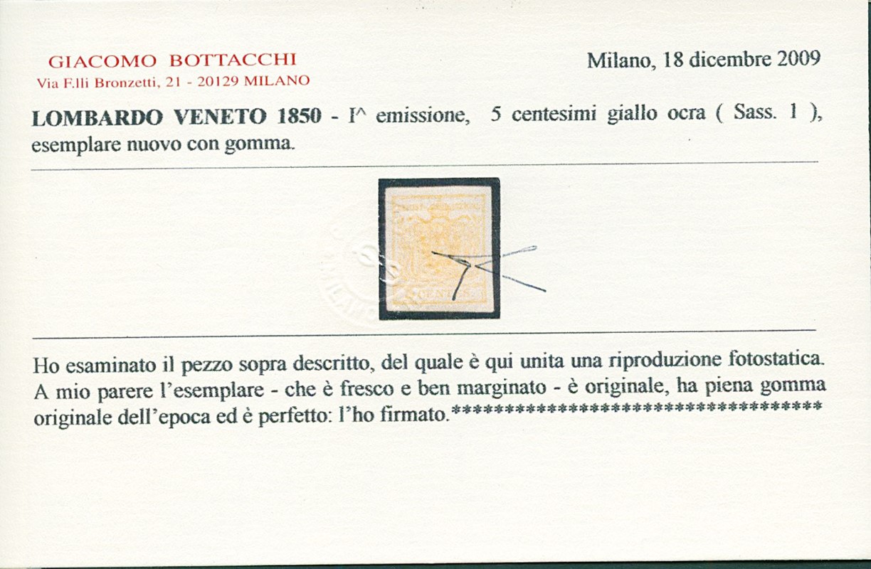 1850 - 5c giallo ocra, nuovo con gomma. CF Bottacchi, Colla e Angelo Zanaria (Sassone 1 - Euro 10.000)