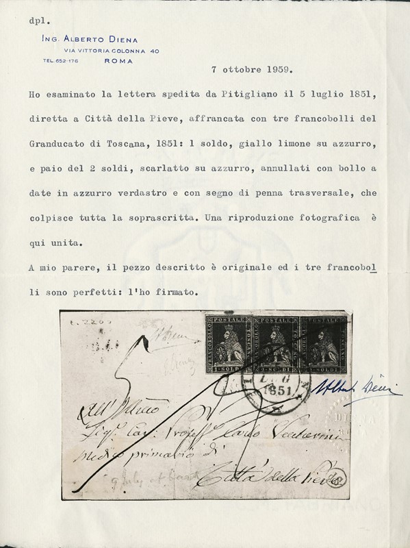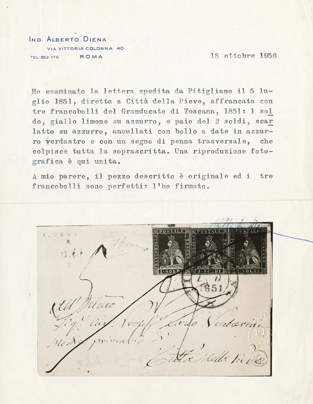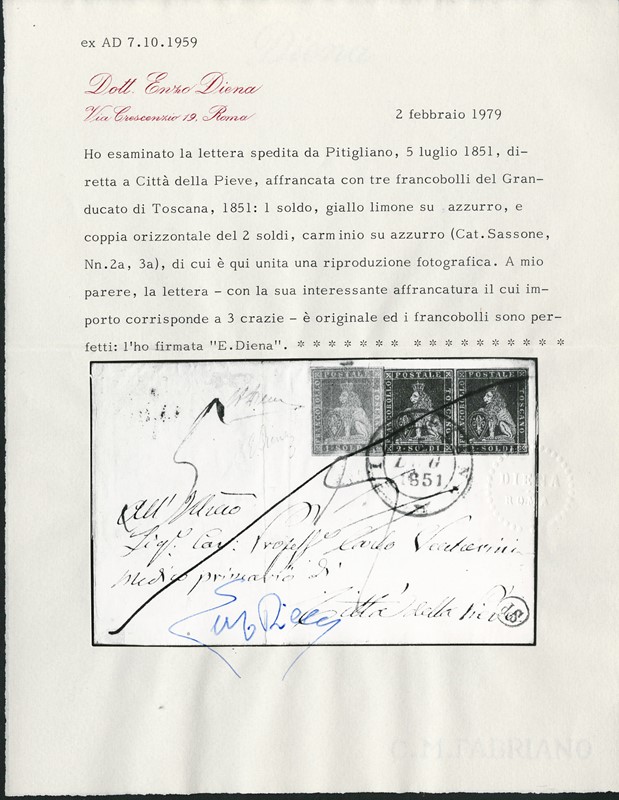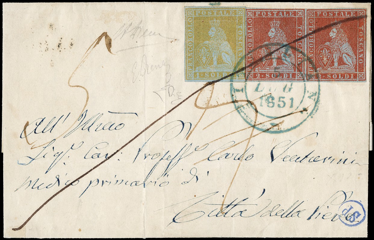 1851 - 1s giallo limone su azzurro e 2s carminio su azzurro, coppia, tutti con filetti completi, da 'PITIGLIANO 5 LUG 1851' a Citta' della Pieve. Lettera affrancata in tariffa di porto semplice fino al confine toscano, tassata a penna in arrivo per le com