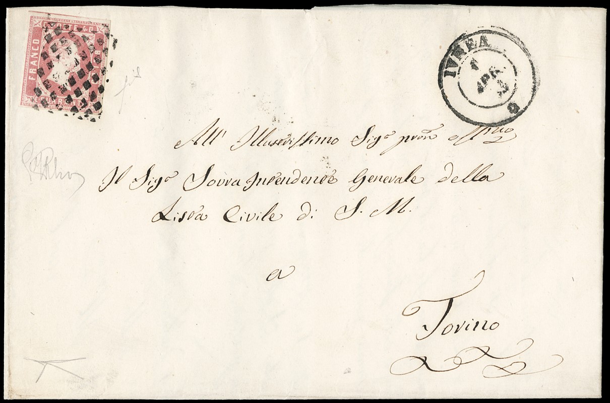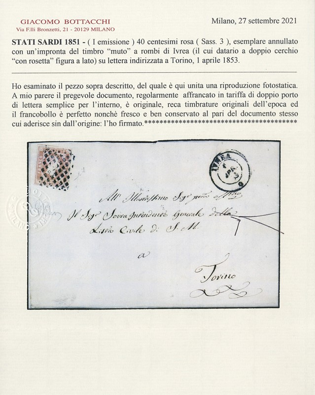 1851 - I emissione, 40c rosa da 'IVREA 1 APR 53' a Torino. Molto fresca, CF Bottacchi (Sassone 3 - Euro 45.000)