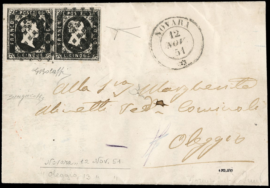 1851 - I emissione, 5c nero, coppia con margini bianchi, su circolare a stampa da 'NOVARA 12 NOV 51' per Oleggio, in tariffa ridotta per stampati. CF Bottacchi e Colla (Sassone 1+pt.7 - Euro 40.000++)