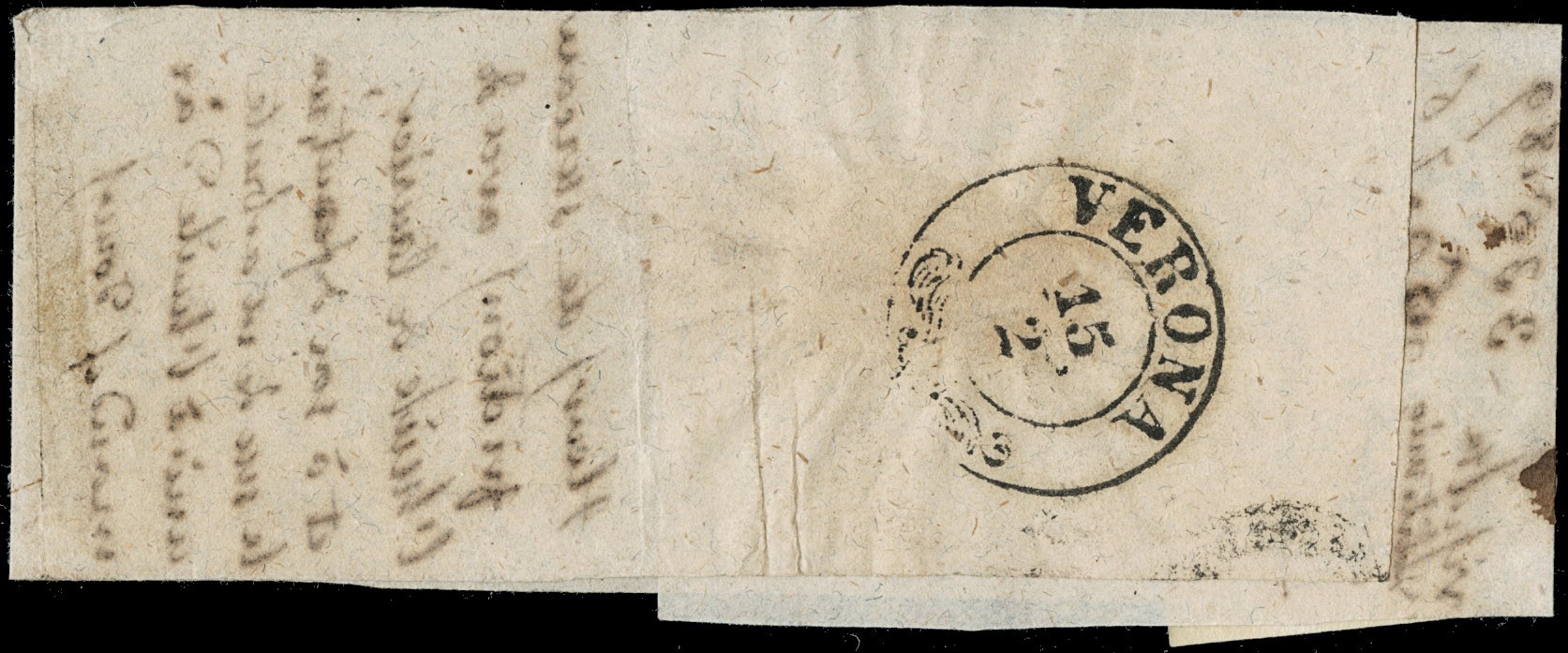 1851 - Mercurio (3 cent.) azzurro grigio I tipo annullato 'DISTRIBUZIONE 2', su fascetta, con al verso arrivo a 'VERONA 15/2'. Firma E.Diena (Sassone FG1b+pt.12 - Euro 9.200)