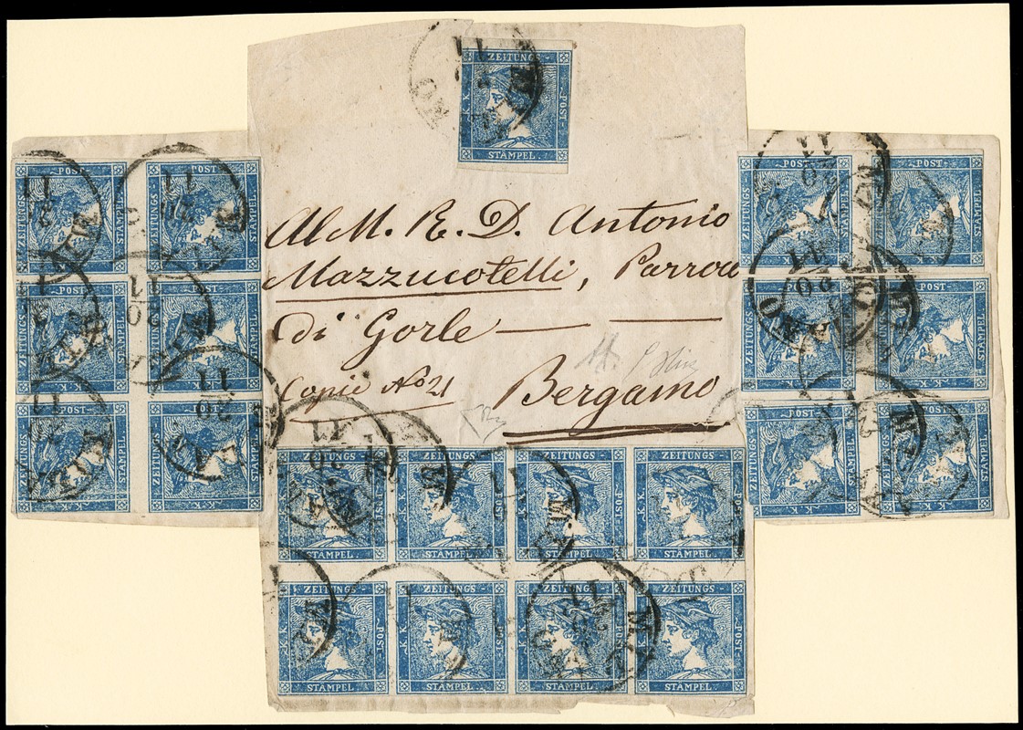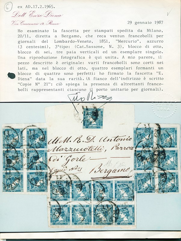 1851 - Mercurio (3 cent) azzurro III tipo, 21 esemplari (un BL6, un BL8, tre coppie e un singolo) su fascetta da 'MILANO 20/11' a Bergamo. Alcuni esemplari leggermente corti, insieme comunque spettacolare. Ciascun esemplare rappresenta un porto per giornali. Rarita', firme A.Diena e Oliva, CF E.Diena (Sassone FG3 - oltre Euro 30.000)