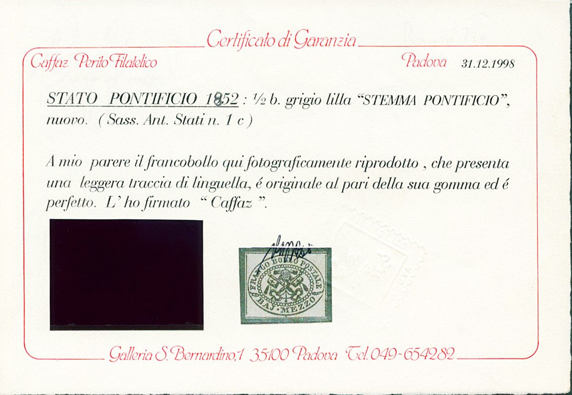 1852 - 1/2b grigio lilla carta a mano e 1/2b violetto carta a macchina, entrambi nuovi con gomma, il violetto con gomma integra. CF Caffaz per il n.1c (Sassone 1c+1Aa - Euro 1.820)