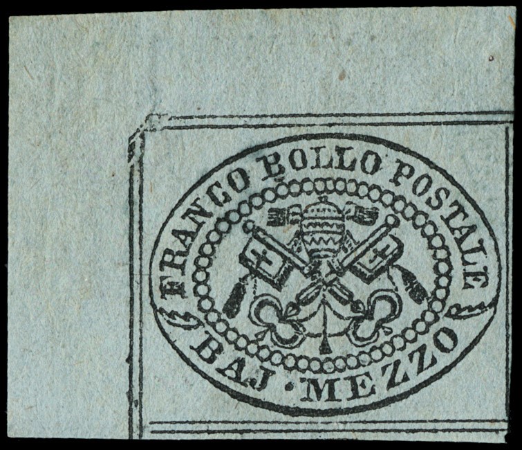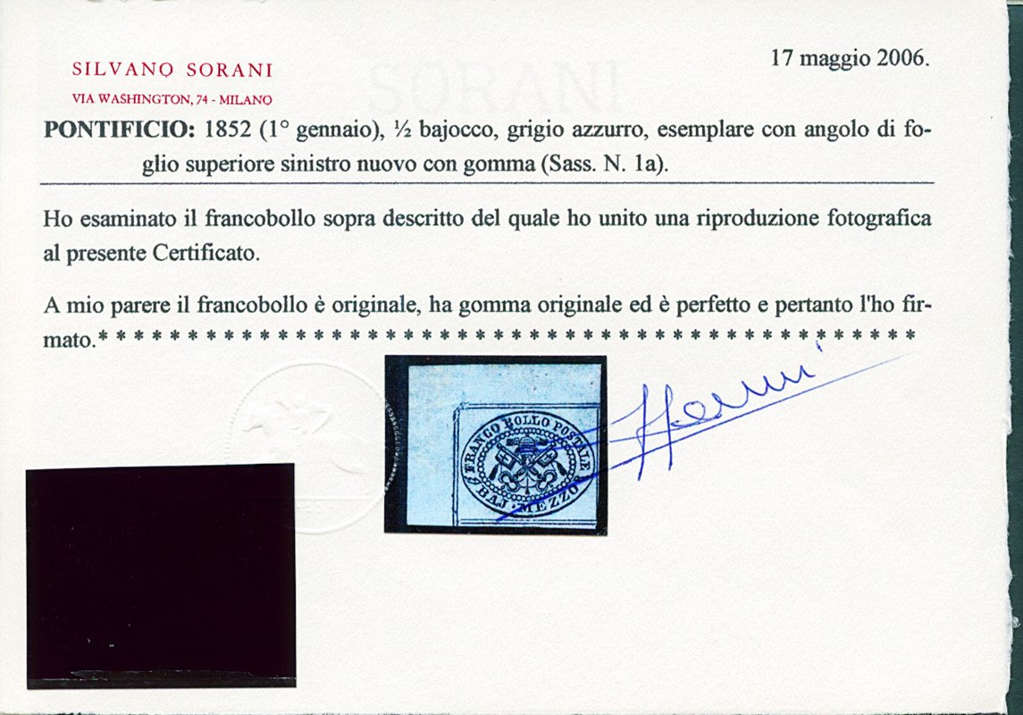 1852 - 1/2baj grigio azzurro AdF superiore sinistro nuovo con gomma. CF Sorani (Sassone 1a - Euro 1.500)