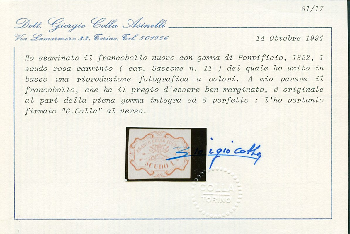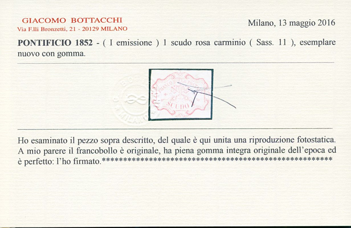 1852 - 1 scudo carminio, ben marginato, nuovo con gomma integra. CF Bottacchi e Colla (Sassone 11 - Euro 15.000)