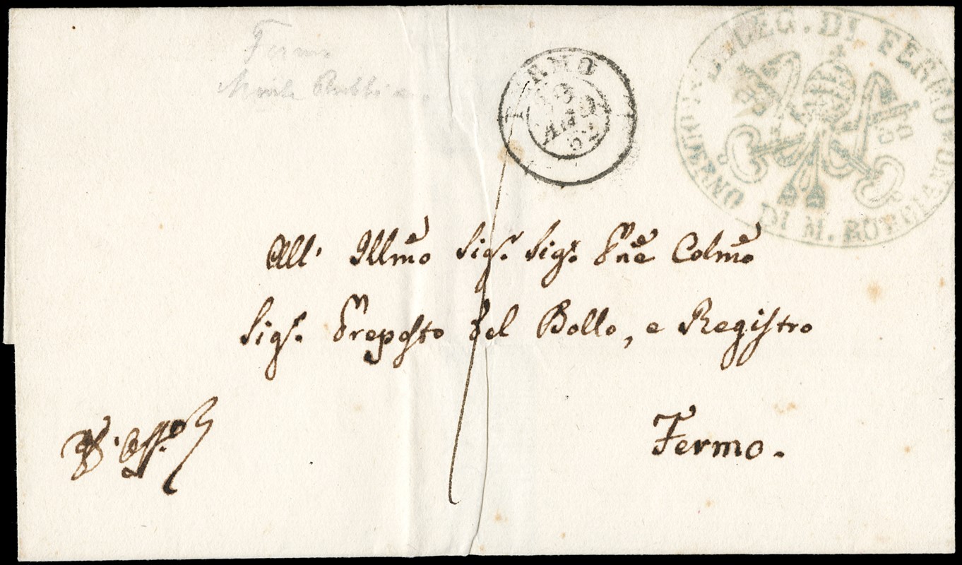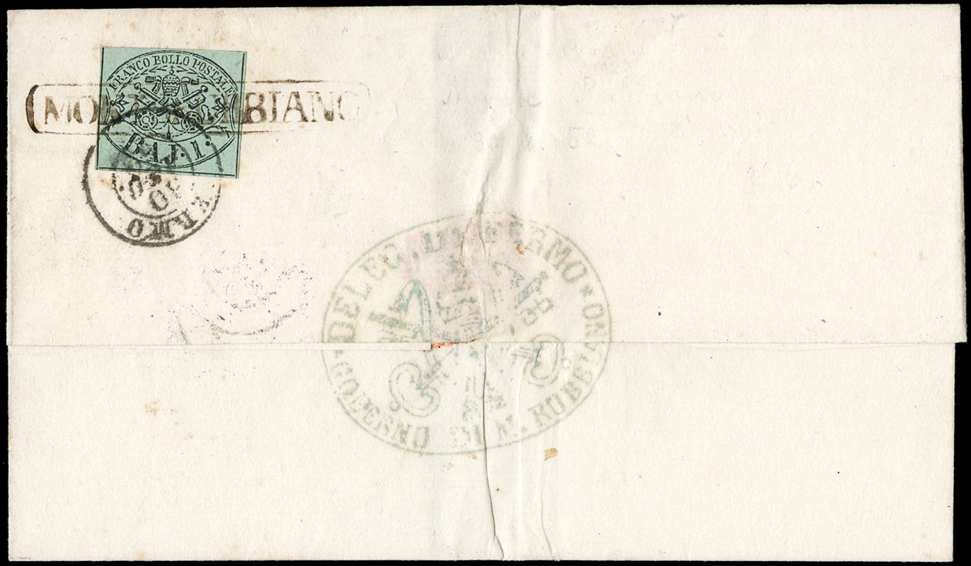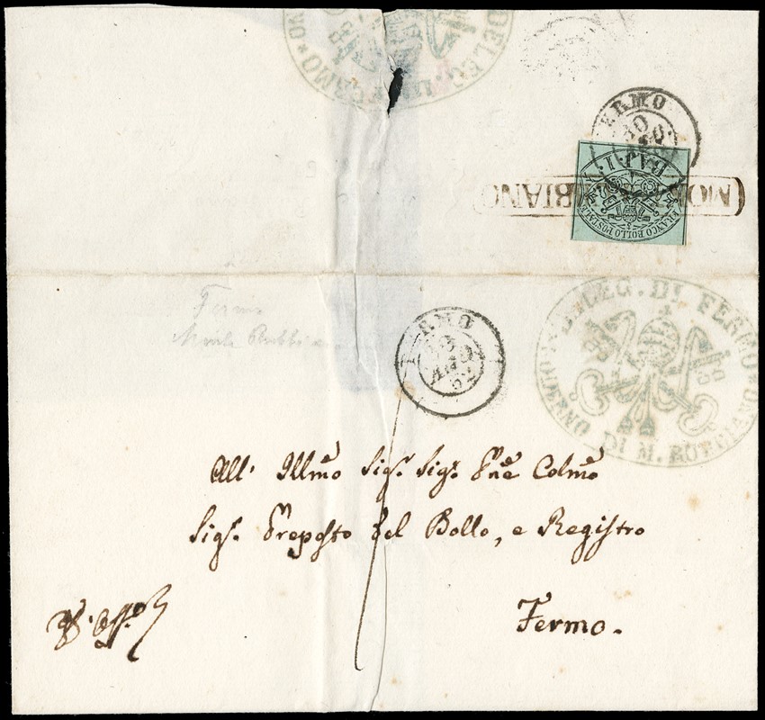 1852 - 1b verde grigiastro al verso di lettera per Fermo, annullato sia con il bollo in cartella 'MONTERUBBIANO', sia con il doppio cerchio 'FERMO 30 AGO 52'. Annullo inedito. CF Manzoni (Sassone 2+pt.12 -stima- Euro 5.500)