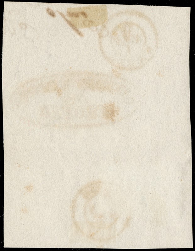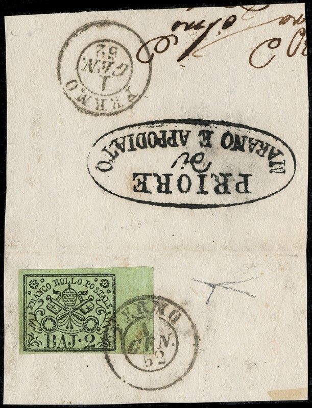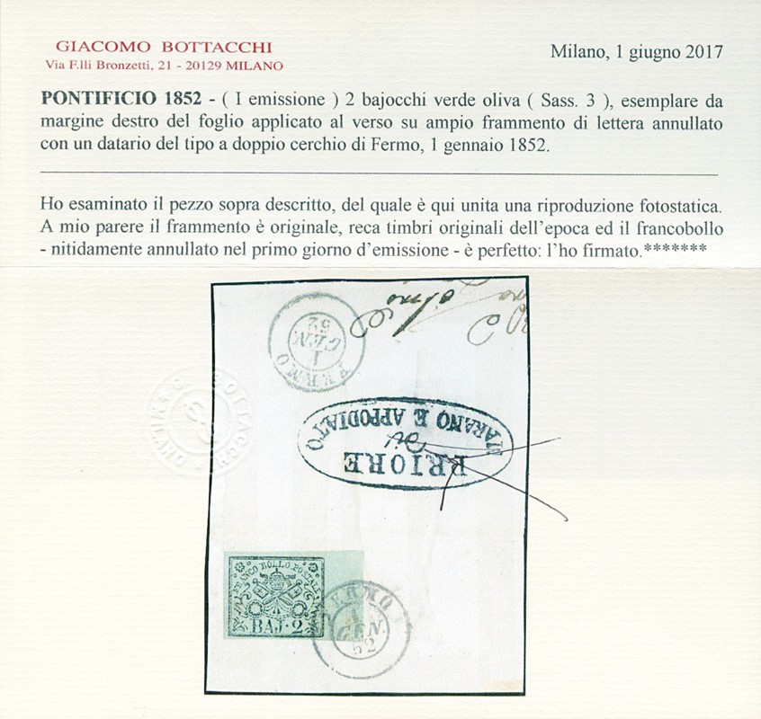 1852 - 2b verde oliva BdF a destra, annullato con doppio cerchio 'FERMO 1 GEN. 52' su grande frammento. Primo giorno d'uso dei francobolli dello Stato Pontificio. Raro su questo valore, annulli molto nitidi. CF Bottacchi (Sassone 3 - Euro 13.000/16.000)