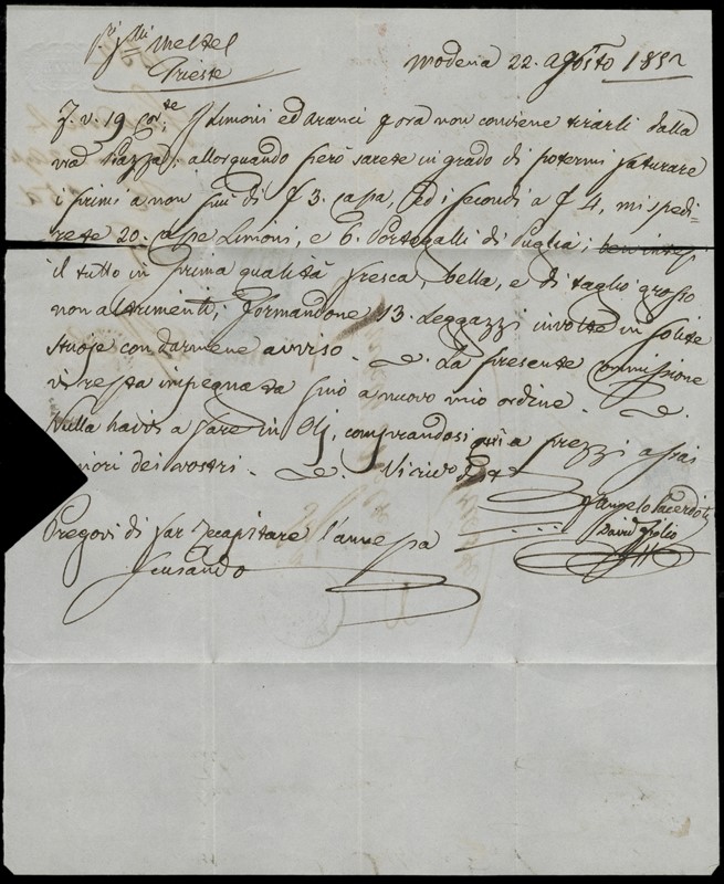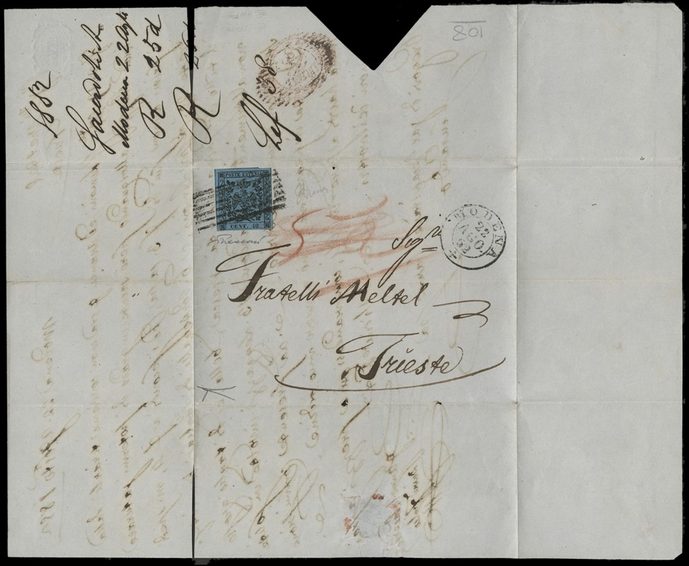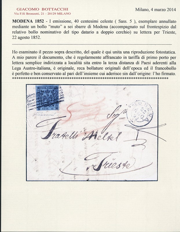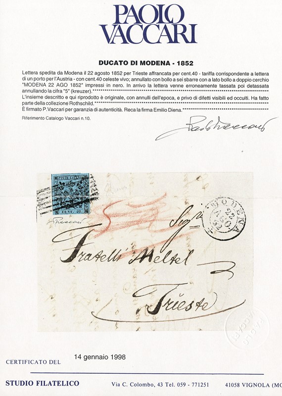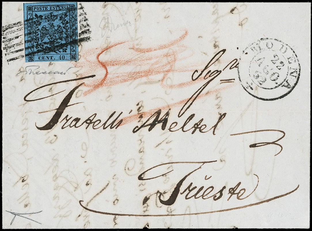 1852 - 40c celeste vivo da 'MODENA 22 AGO 52' a Trieste, tariffa corrispondente a lettera di un porto per l'Austria. La missiva venne erroneamente tassata e poi detassata, annullando la cifra 5 (kreuzer). Ex collezione Rotschild, CF Vaccari e Bottacchi (Sassone 5 - Euro 27.500)