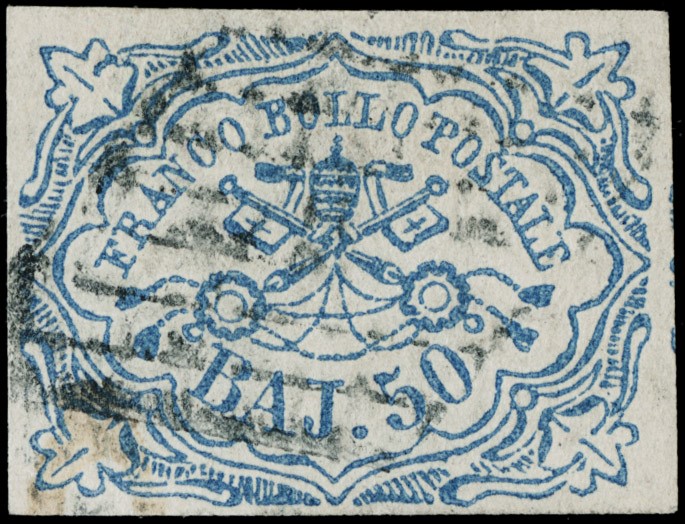 1852 - 50b azzurro, ampi margini, annullato a grig