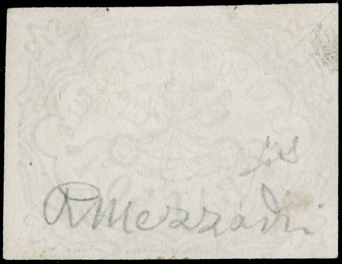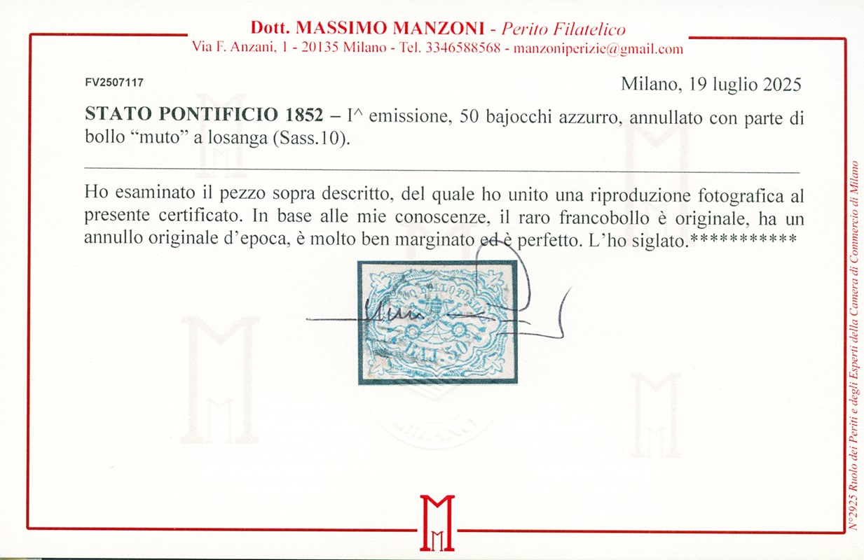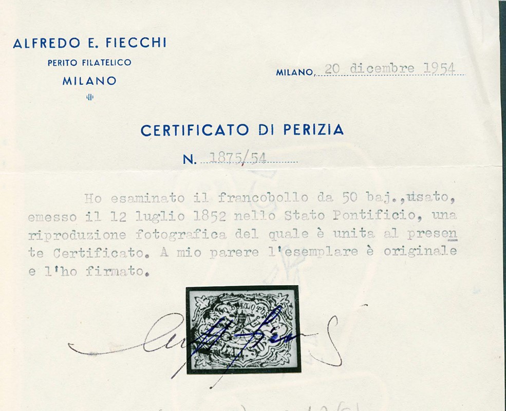 1852 - 50b azzurro, ampi margini, annullato a griglia. Firma Mezzadri, CF Fiecchi e Manzoni (Sassone 10 - Euro 3.500)