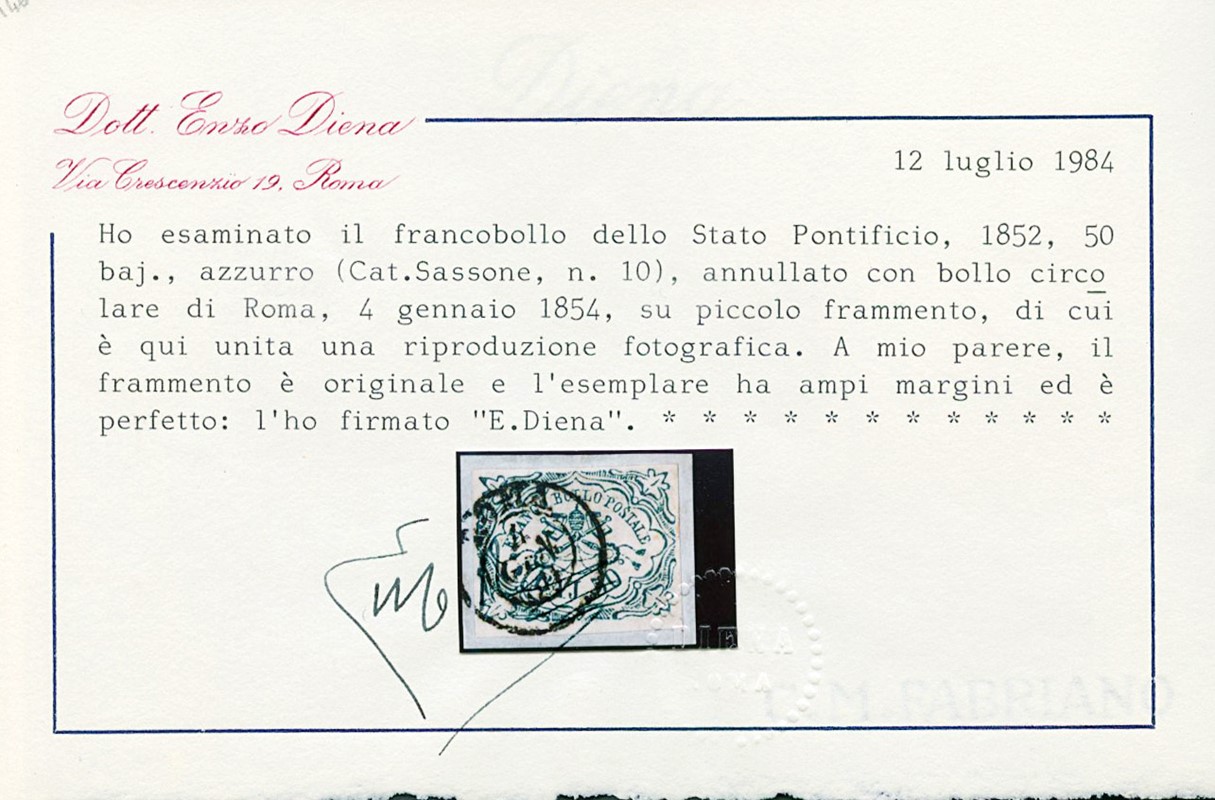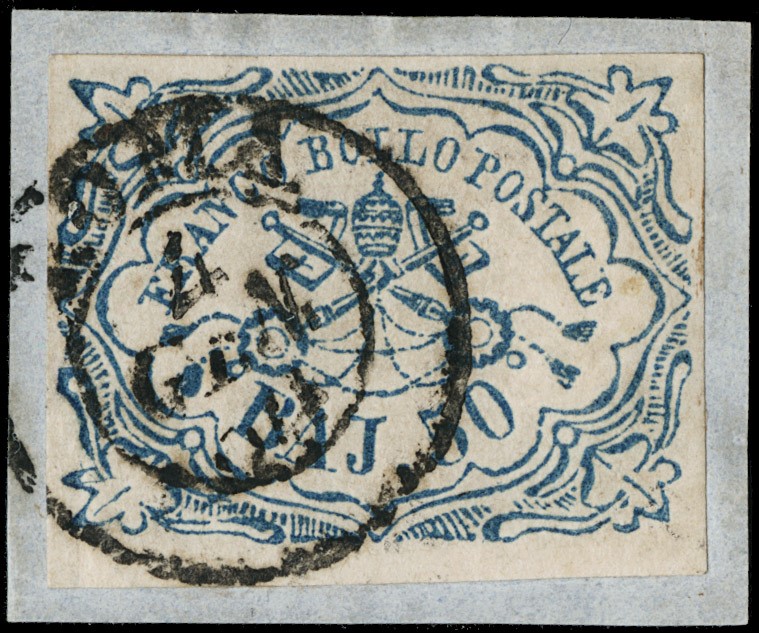 1852 - 50b azzurro molto ben marginato con annullo circolare di Roma su piccolo frammento. CF E.Diena (Sassone 10 - Euro 6.500)