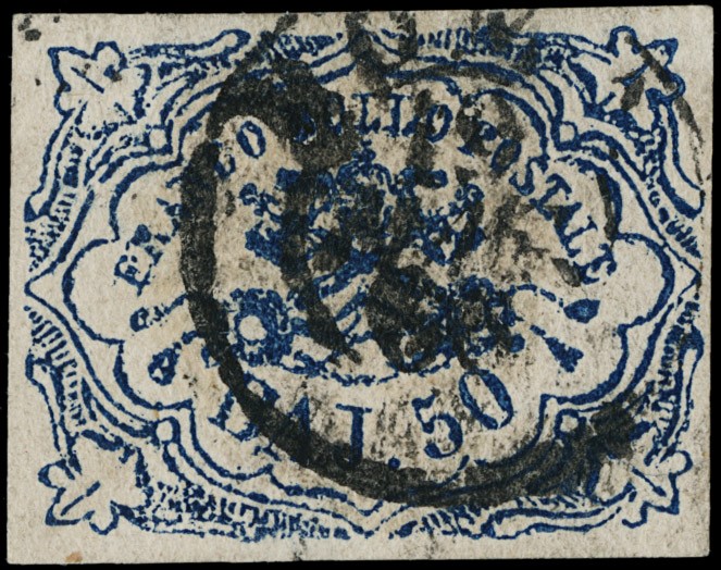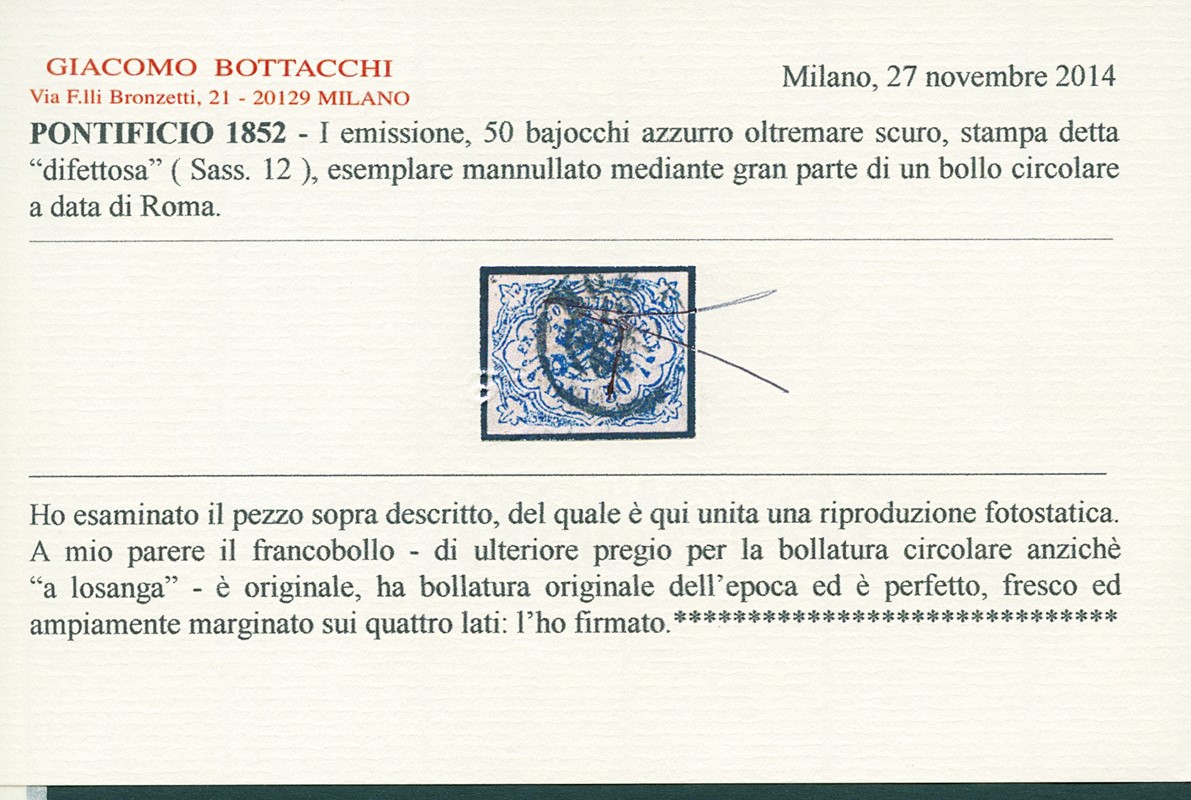 1852 - 50b azzurro oltremare scuro stampa difettosa, ben marginato, annullato con bollo circolare di 'ROMA'. Sigla A.Diena, CF Bottacchi (Sassone 12 - Euro 11.000)