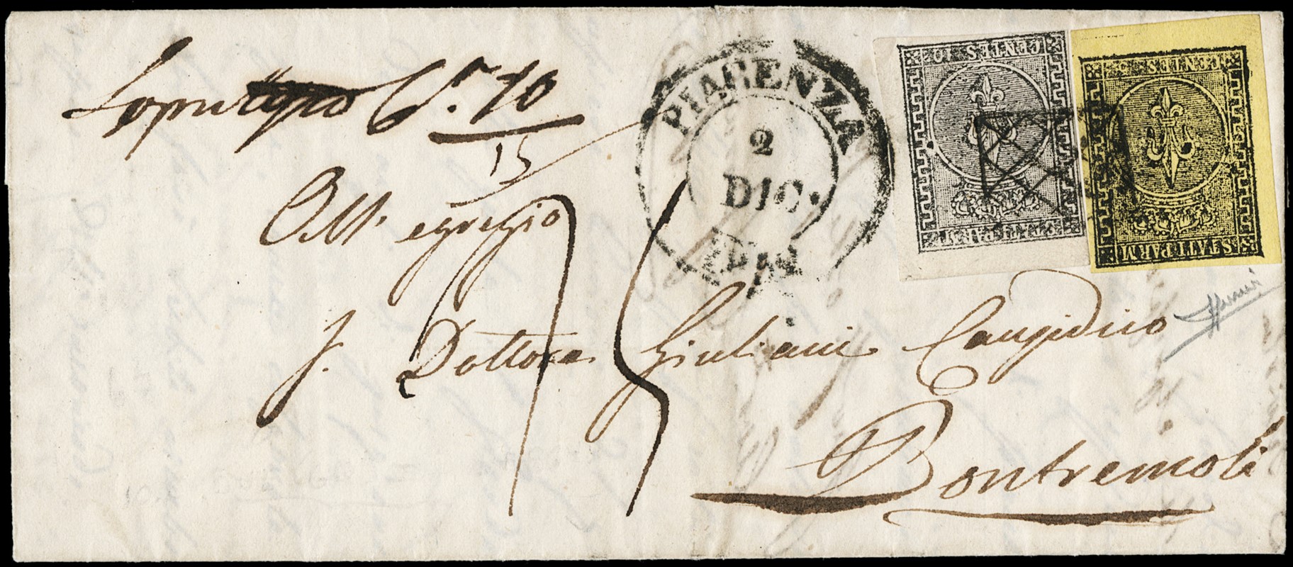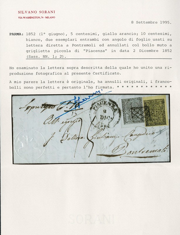1852 - 5c giallo e 10c bianco, entrambi AdF, annullati con griglietta da 'PIACENZA 2 DIC.' 1852 per Pontremoli. Qualita' eccezionale, CF Sorani (Sassone 1a+2 - Euro -)
