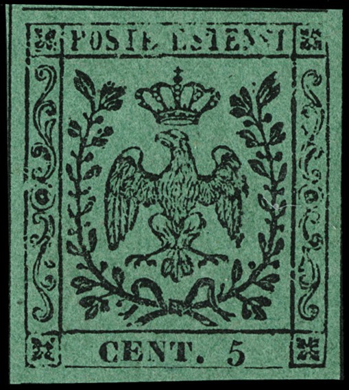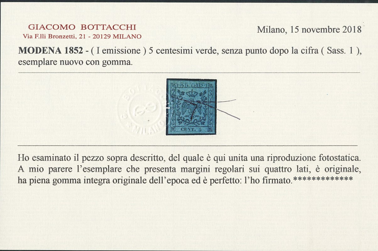 1852 - 5c verde senza punto dopo la cifra, gomma integra e grandi margini. Firma Giulio Bolaffi, CF Bottacchi (Sassone 1 - Euro 14.000)