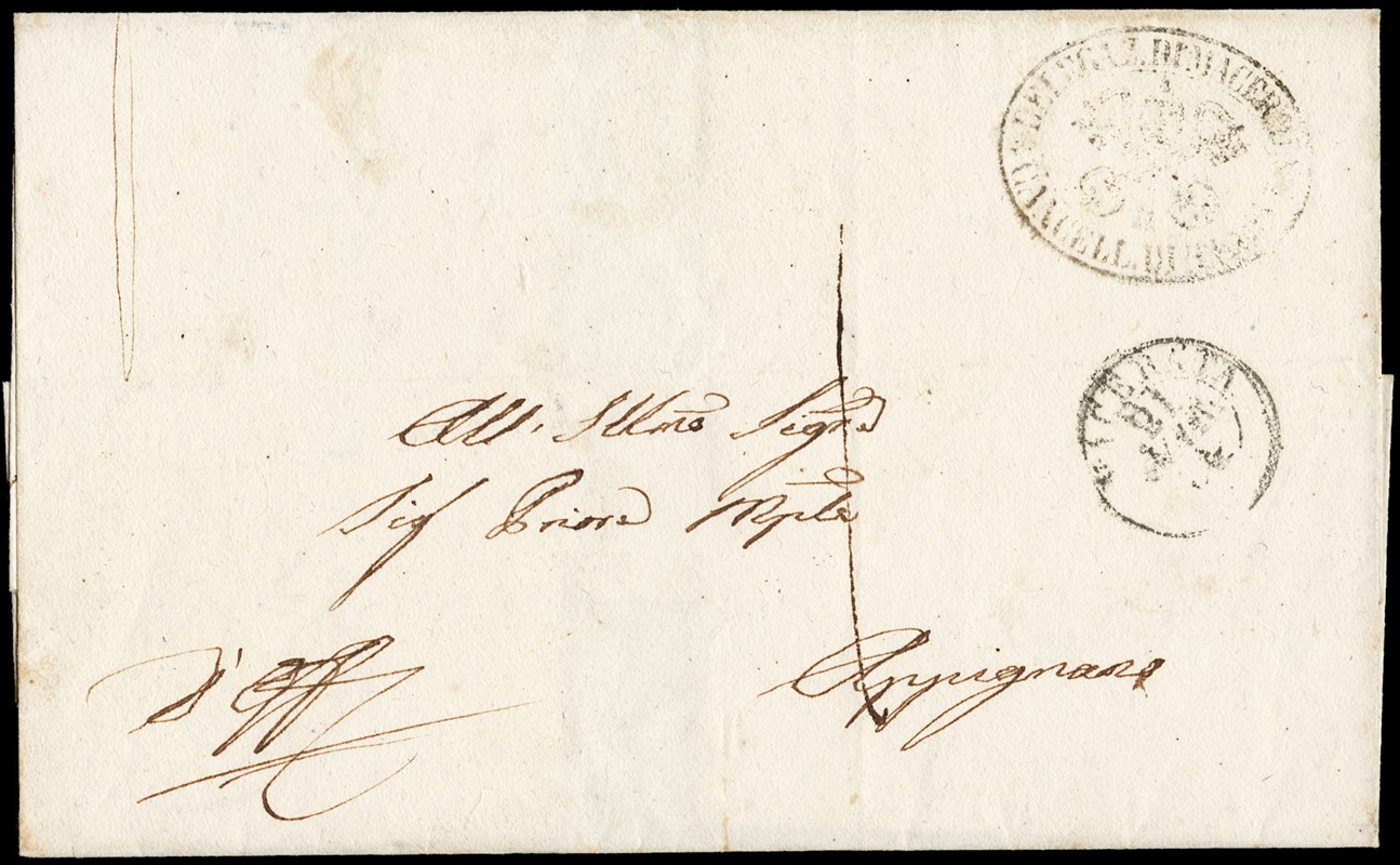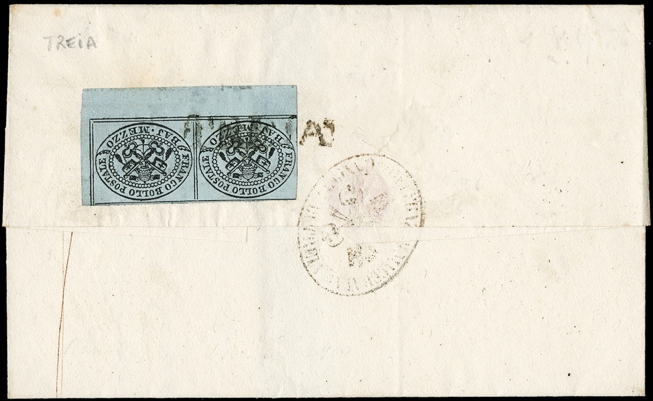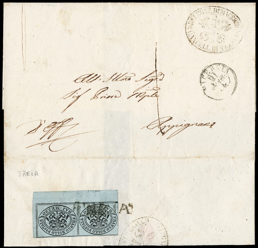 1852 - insieme di due lettere con annullo 'TREJA': una con 1/2b grigio azzurro, coppia orizzontale BdF, da 'TREJA' (SD) ad Appignano, in porto assegnato, l'altra con 1b verde grigiastro da 'TREJA' (SD) a Macerata (Sassone 1a+pt.7 + 2+pt.7 - Euro 2.550+)