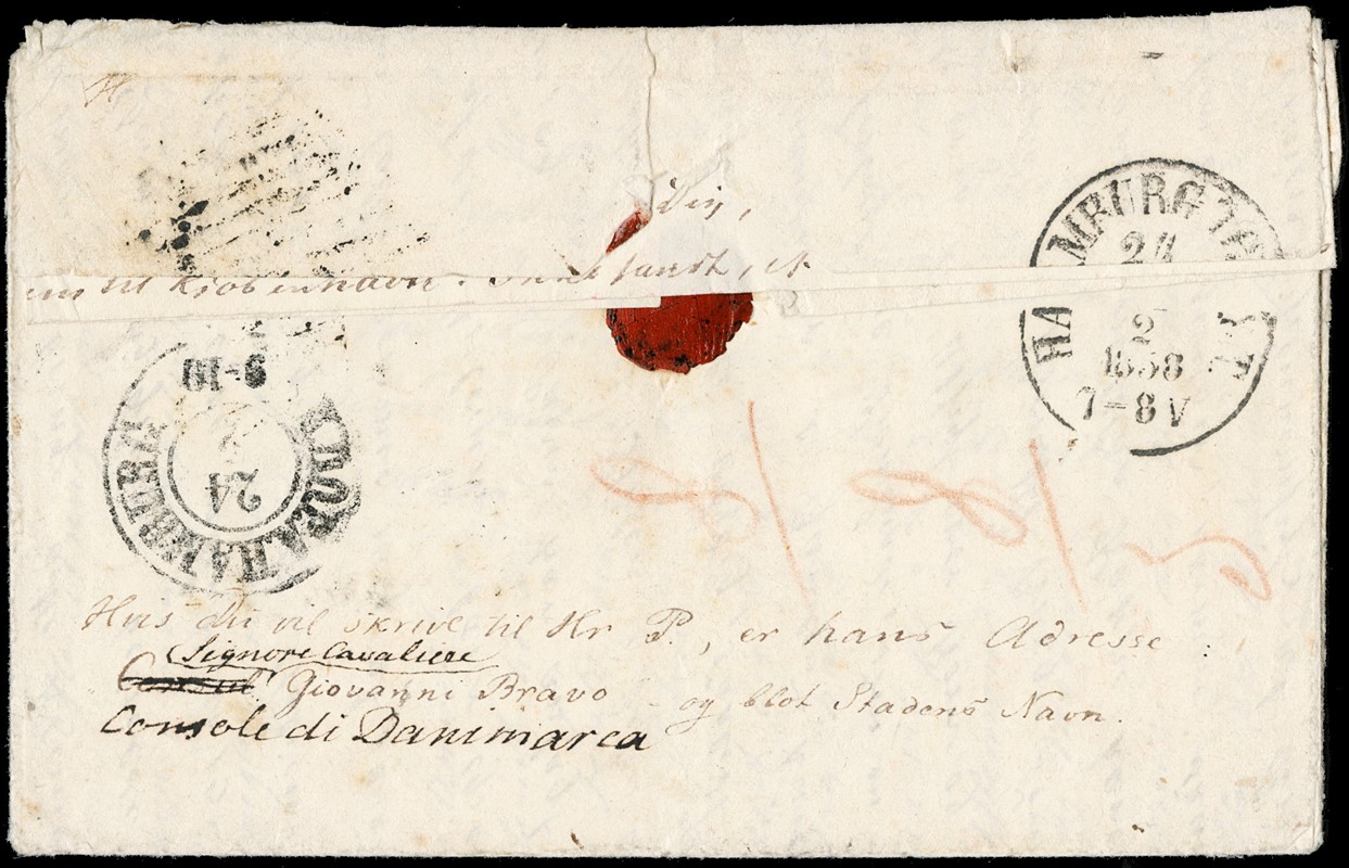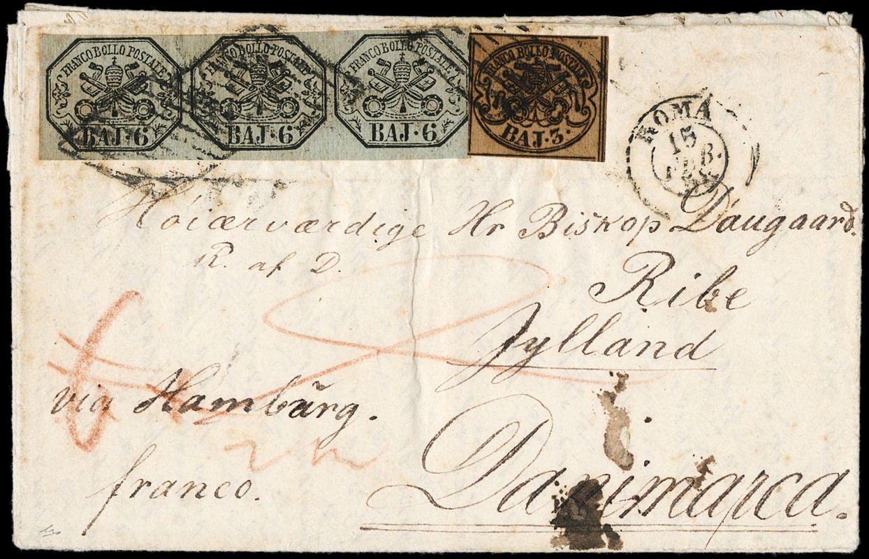 1852 - Stato Pontificio, 3b bruno e 6b grigio verdastro, ST3 orizzontale, da 'ROMA 15 FEB 58' a Copenaghen, via di terra attraverso gli Stati Tedeschi. Pregiato oggetto di storia postale, splendida (Sassone 4Aa+7 - Euro 3.550+)