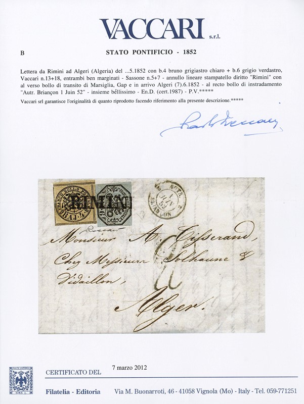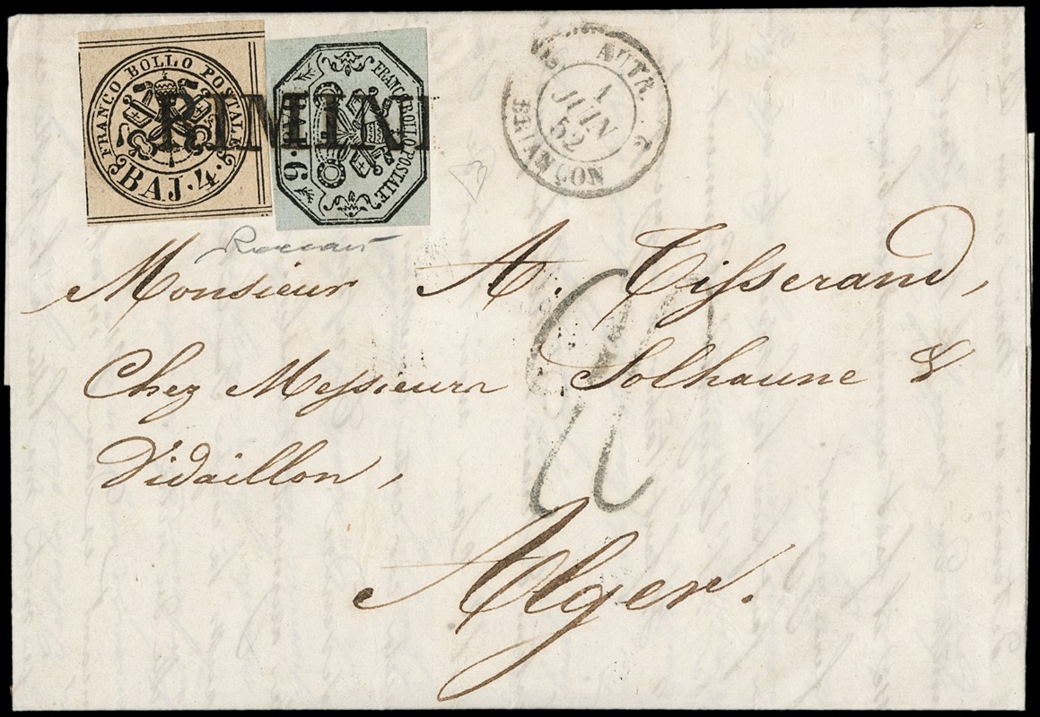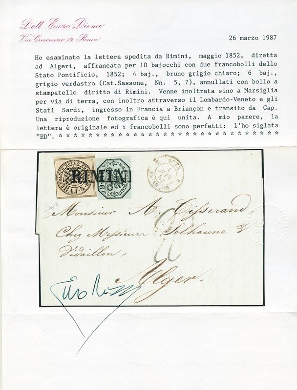 1852 - Stato Pontificio, 4b bruno grigio chiaro e 6b grigio verdastro, da 'RIMINI' (SD) per Algeri. Missiva affrancata fino al confine pontificio e inoltrata via di terra fino a Marsiglia, dove fu imbarcata su un postale francese fino a destinazione, e qui tassata per 2 franchi. Al recto bollo di passaggio 'AUTR. 2 BRIANCON 2 1 JUIN 52' e al verso arrivo ad 'ALGER 7 JUN'. Splendido e non comune. CF E.Diena e Vaccari (Sassone 5+7 - Euro - )