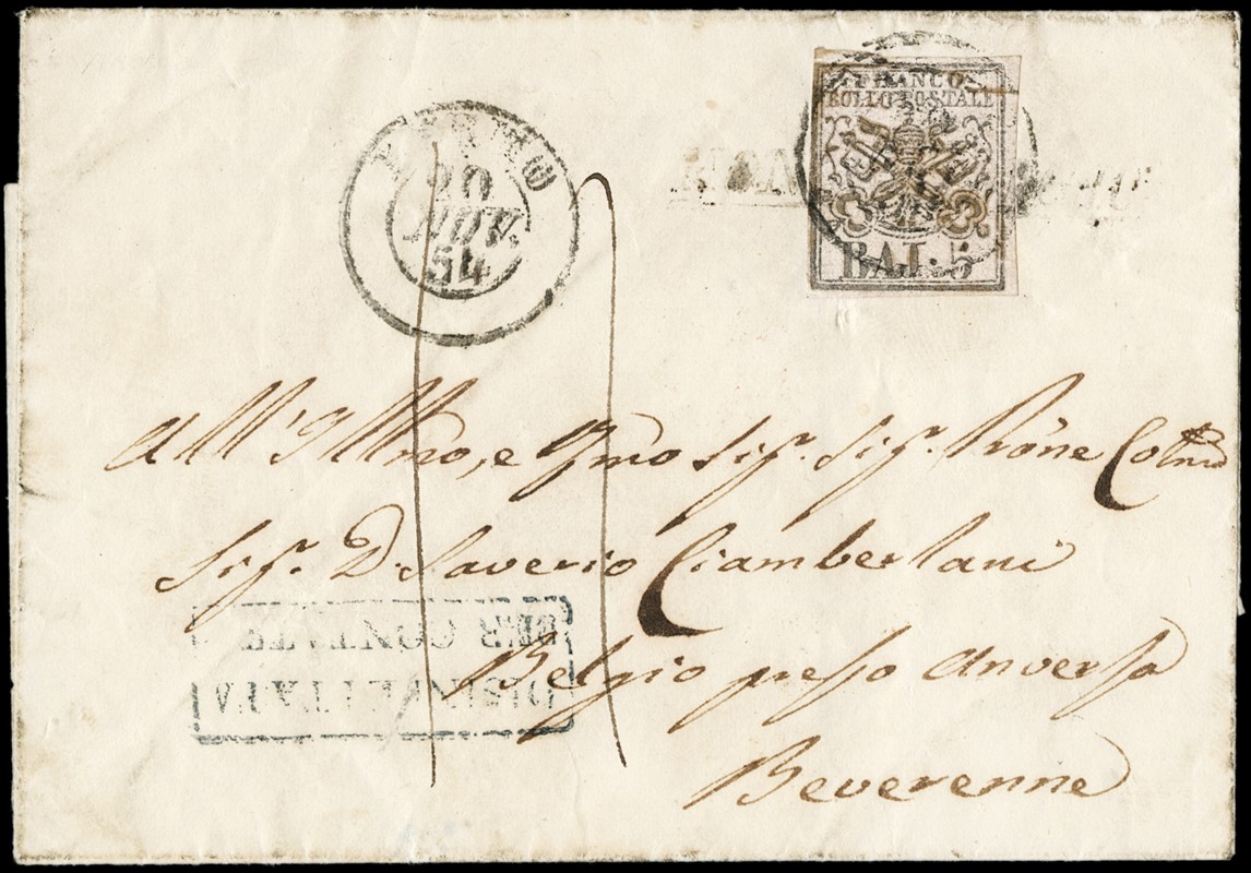 1852 - Stato Pontificio, 5b bianco rosaceo, da 'MONTEGIORGIO' a Beveren annullato sia con il doppio cerchio 'FERMO 20 NOV 54', sia con il bollo stampatello diritto 'MONTEGIORGIO'. Sulla soprascritta 'DISINFETTATA PER CONTATTO' in cartella. Interessantissima lettera per il Belgio, inoltrata via di terra attraverso gli Stati Tedeschi. Splendida (Sassone 6b - Euro - )