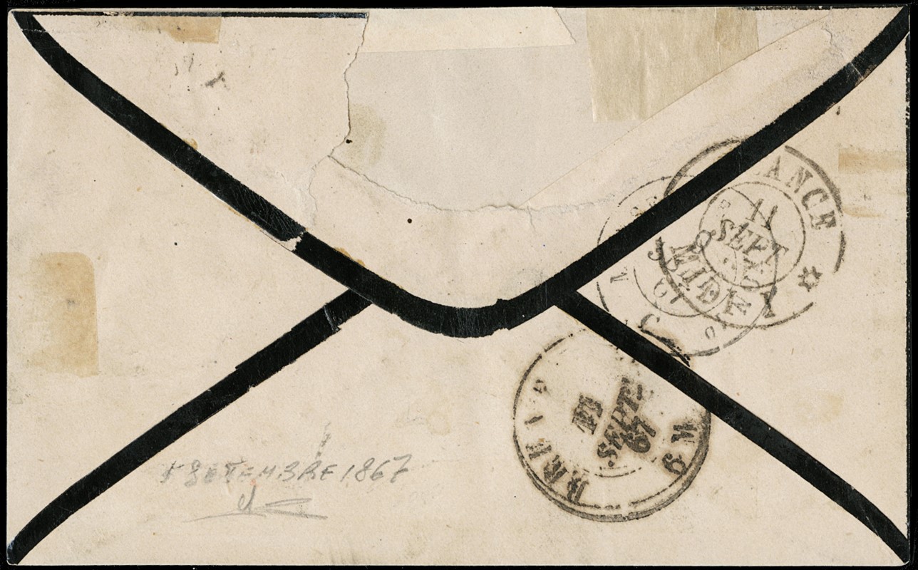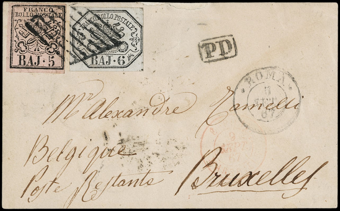 1852 - Stato Pontificio, 5b rosa carminio e 6b grigio perla, da 'ROMA 5 SET 67' a Bruxelles. Interessante lettera per il Belgio, inoltrata franca a destino via di Francia. Splendida (Sassone 6A+7Aa - Euro 2.000+)
