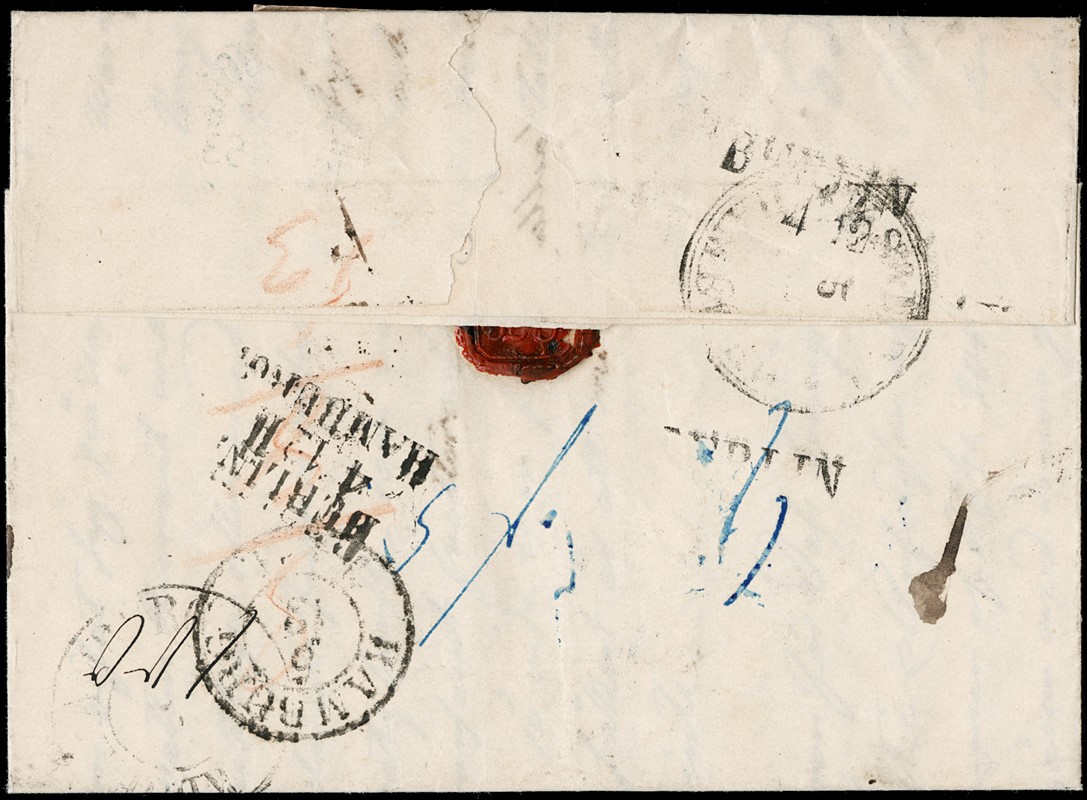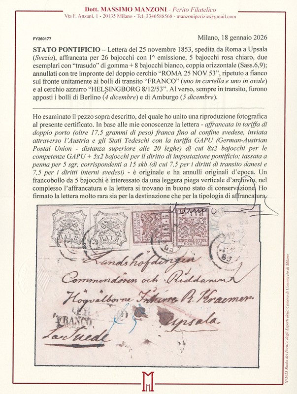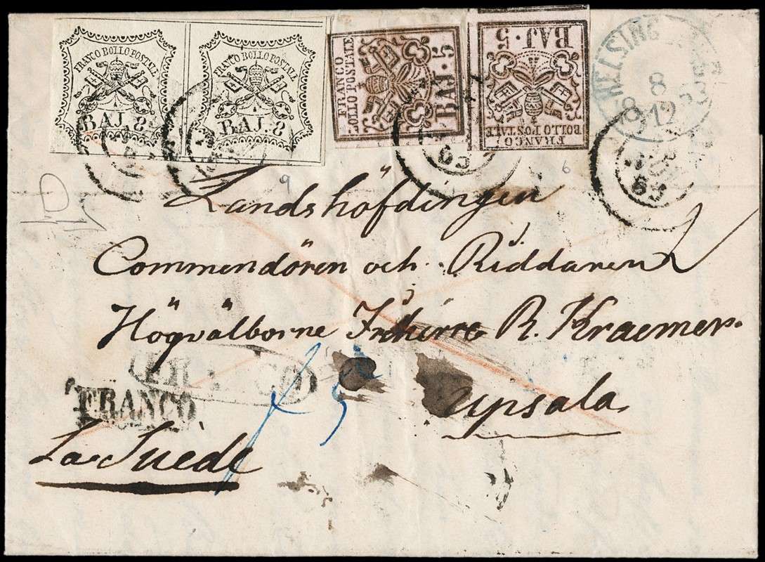 1852 - Stato Pontificio, 5b rosa chiaro, due esemplari, e 8b bianco, coppia orizzontale, da 'ROMA 25 NOV 53' a Upsala (Svezia), inoltrata dalla via di terra con la mediazione austriaca. Al verso vari bolli di passaggio, tra cui Berlino e Amburgo. Qualche difetto sui francobolli da 5b, oggetto di storia postale comunque molto raro per destinazione e affrancatura. CF Manzoni (Sassone 6+9 - Euro - )