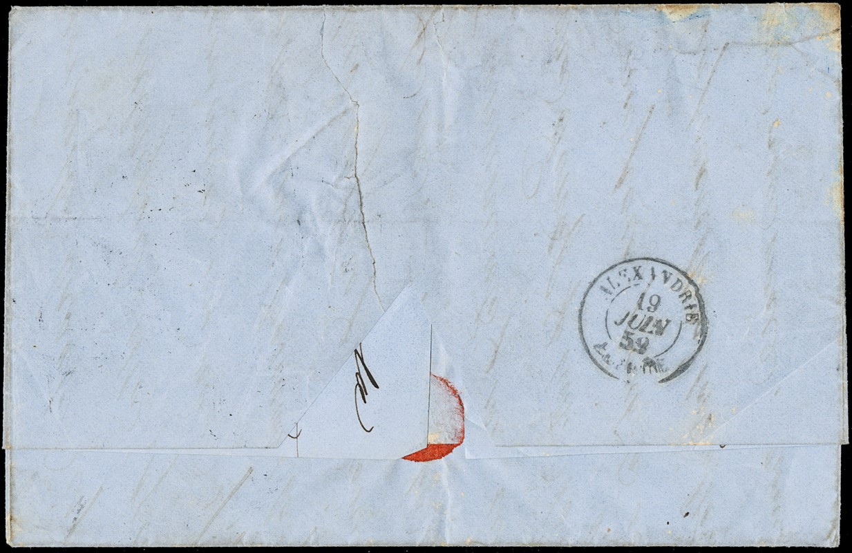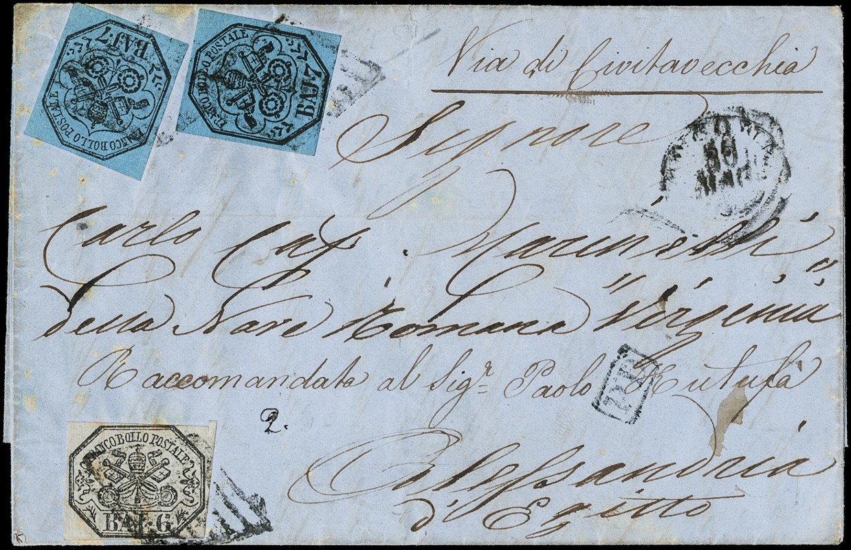 1852 - Stato Pontificio, 6b grigio e 7b azzurro, due esemplari, da 'ANCONA 30 MAG 59' ad Alessandria d'Egitto, inoltrata franca a destino per mare 'Via di Civitavecchia', con un postale francese. Rara destinazione, splendida (Sassone 7a+8 - Euro - )