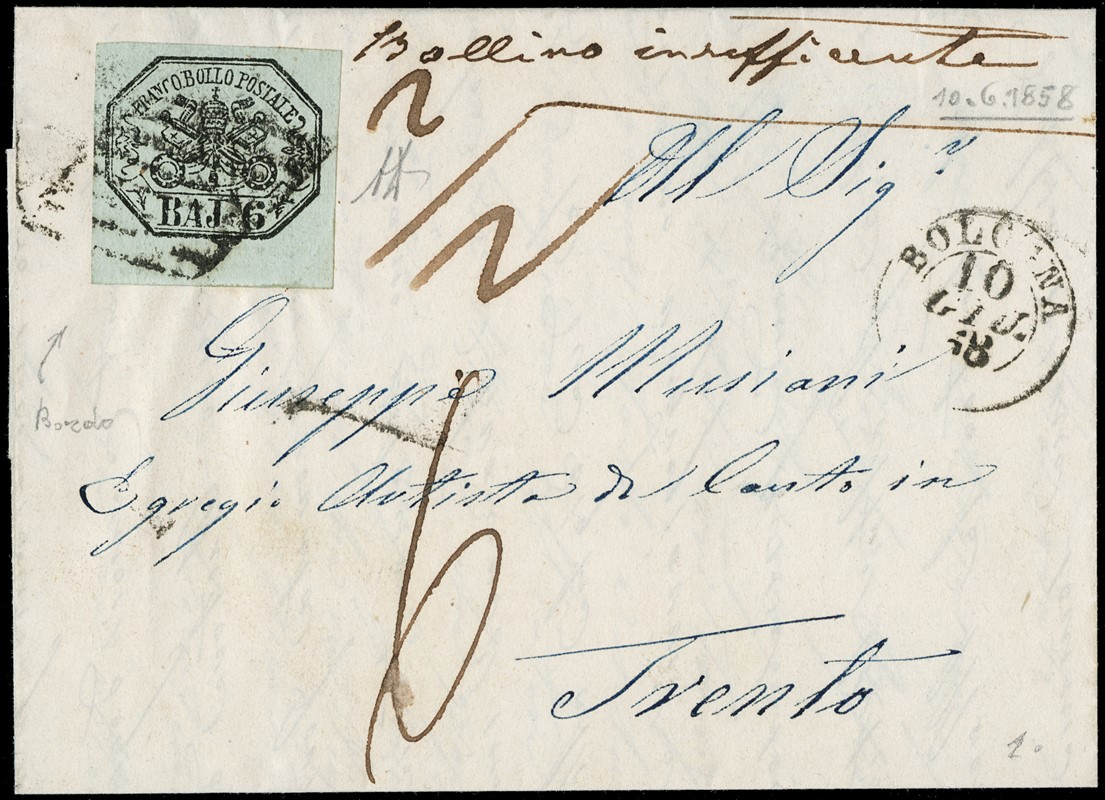 1852 - Stato Pontificio, 6b grigio verdastro con grandi margini e BDF inferiore, da 'BOLOGNA 10 GIU 58' a Trento. Lettera tassata a causa dell'affrancatura insufficiente. Splendida e molto interessante. Sigla A.Diena (Sassone 7 - Euro - )