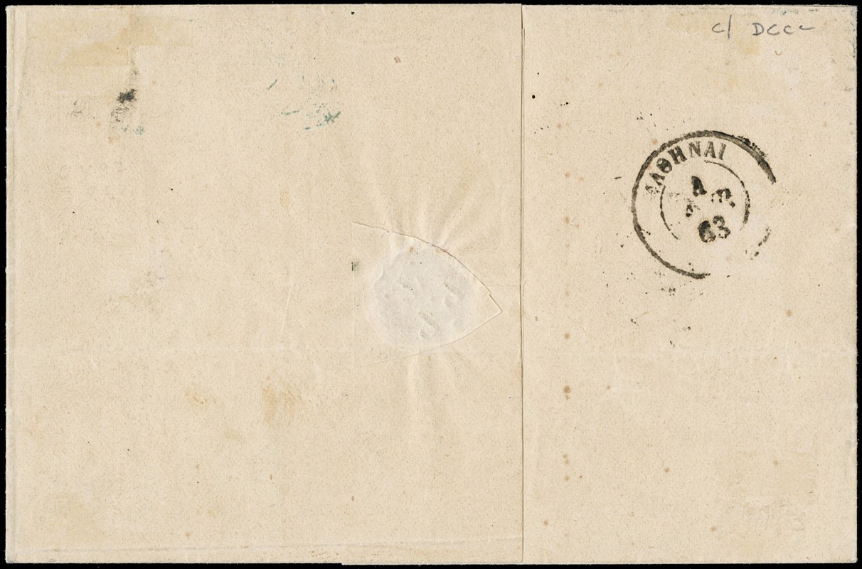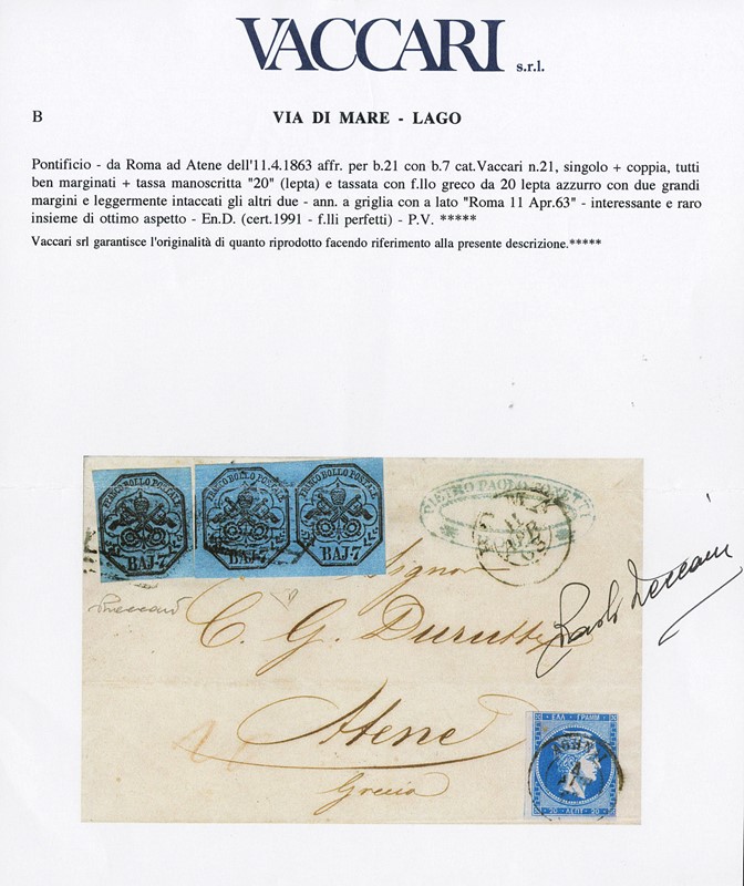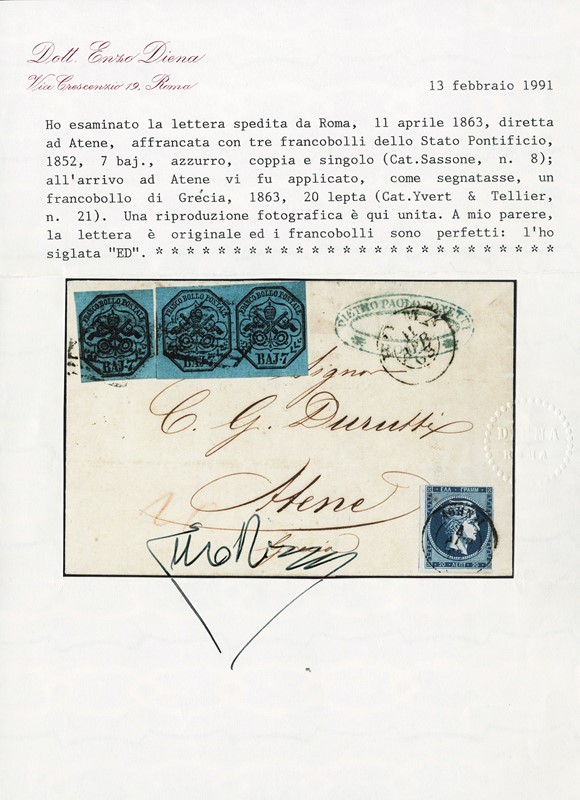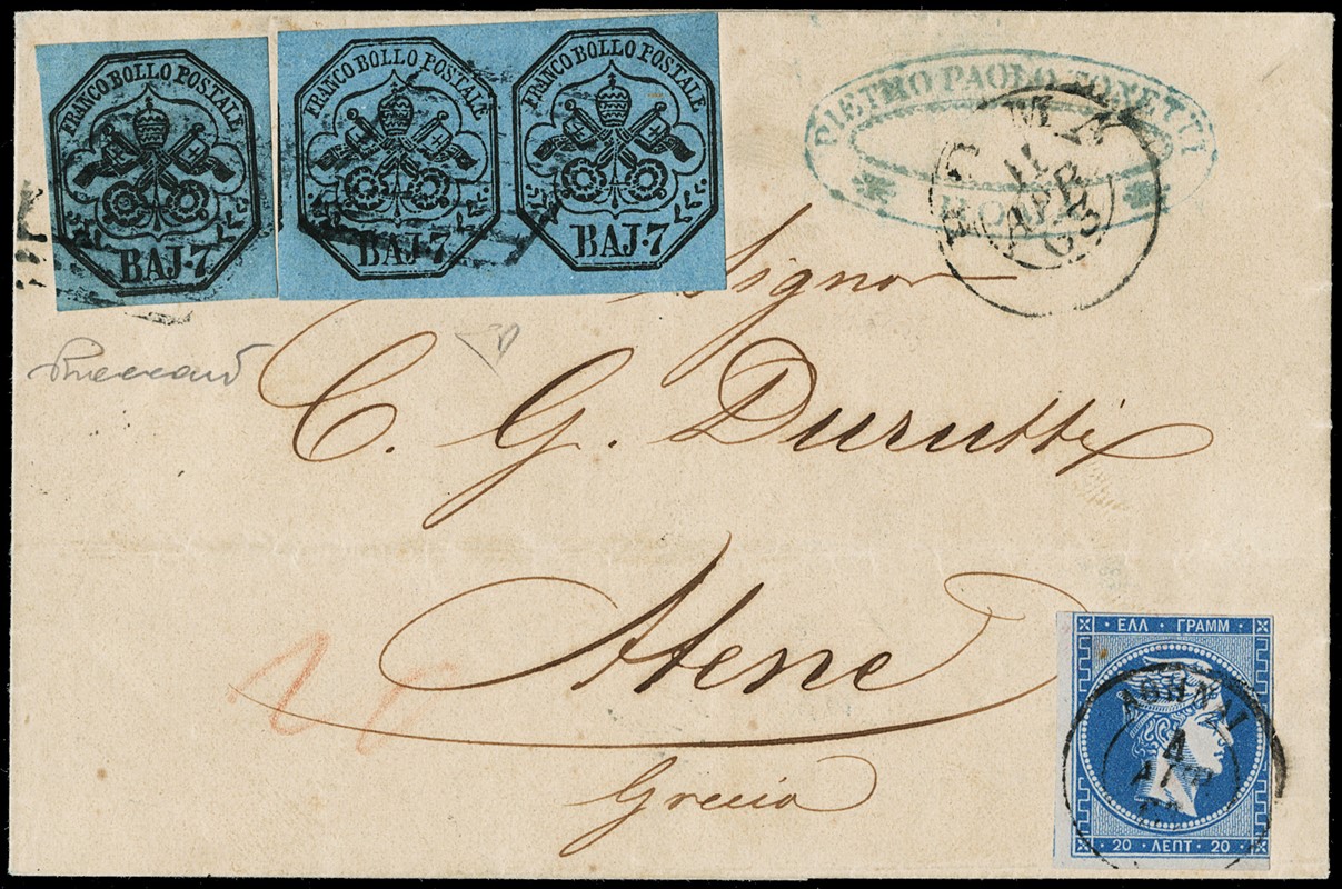 1852 - Stato Pontificio, 7b azzurro, coppia orizzontale e singolo, da 'ROMA 11 APR 63' ad Atene, tassata in arrivo con un francobollo greco da 20 lepta (corto). Interessante e pregiato oggetto di storia postale. Splendido, CF E.Diena e Vaccari (Sassone 8