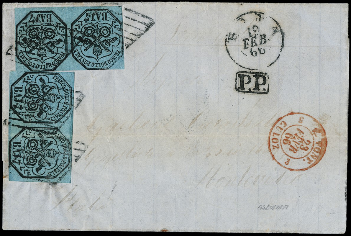 1852 - Stato Pontificio, 7b azzurro, due coppie orizzontali (di cui una con piega orizzontale d'archivio), da 'ROMA 19 FEB 66' a Montevideo (Uruguay). Destinazione non comune, di cui si conoscono pochi altri casi analoghi (Sassone 8 - Euro - )