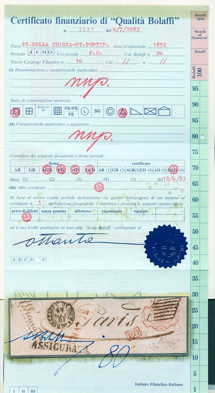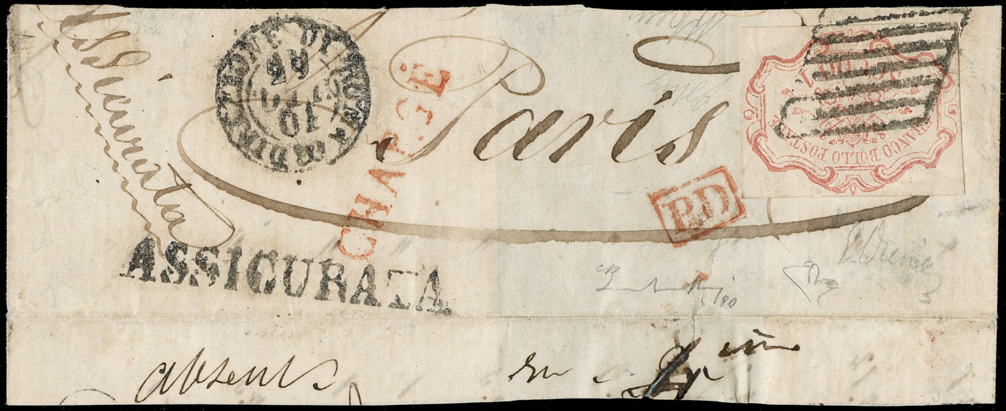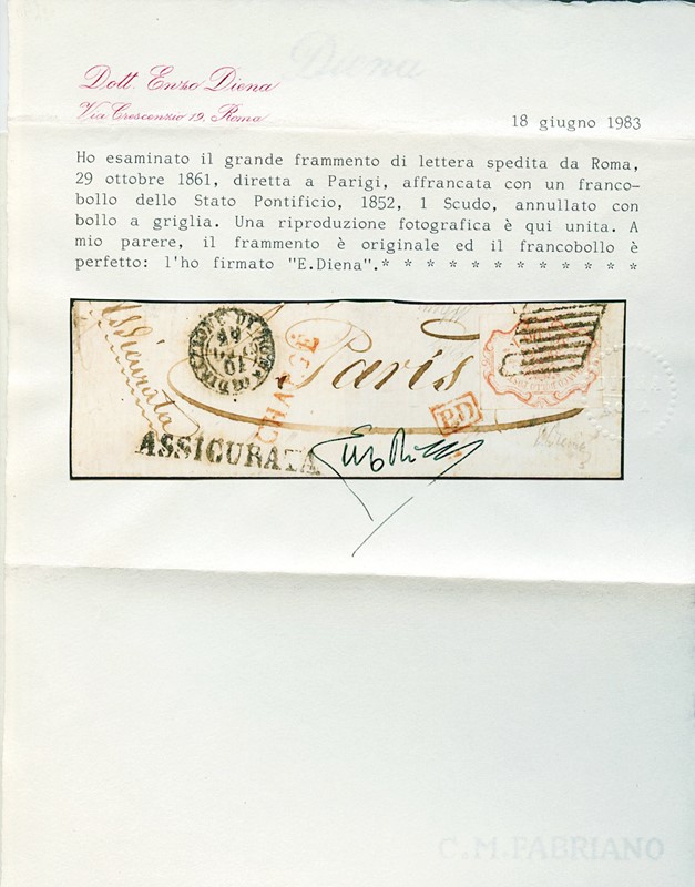 1853 - 1s rosa carminio, molto ben marginato, annullato con muto a losanga su grande frammento di assicurata da 'ROMA 29 OTT 61' a Parigi. Raro. Firme Em. e A.Diena, CF E.Diena e Finanziario Bolaffi (Sassone 11 - Euro - )