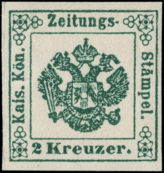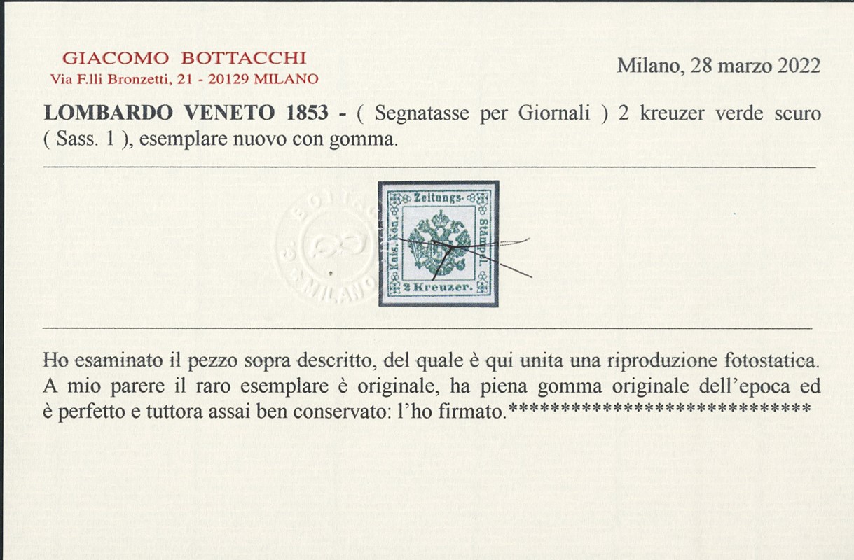 1853 - 2kr verde, nuovo con gomma. Raro, CF Bottacchi (Sassone SG1 - Euro 32.000)