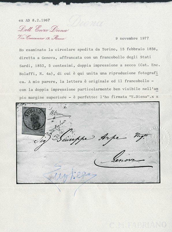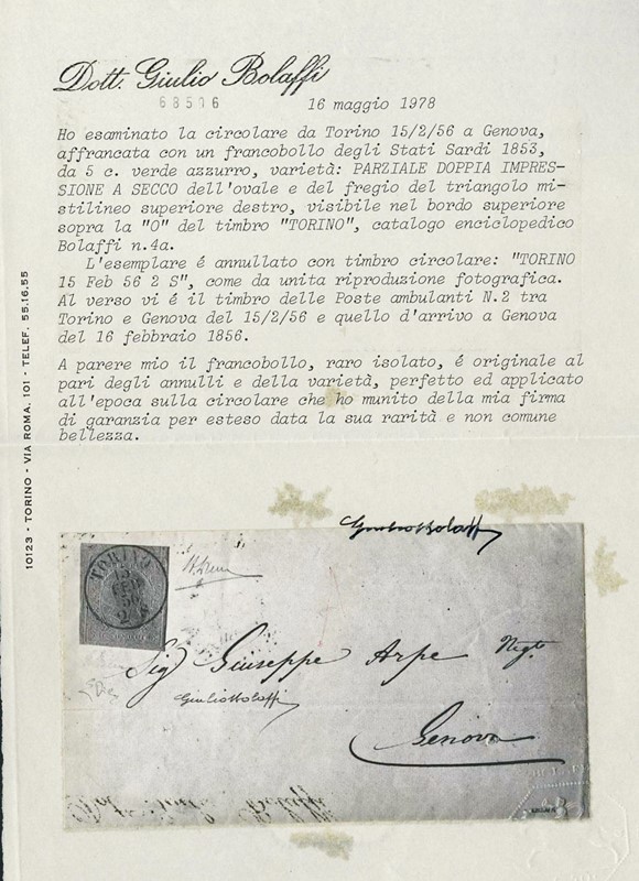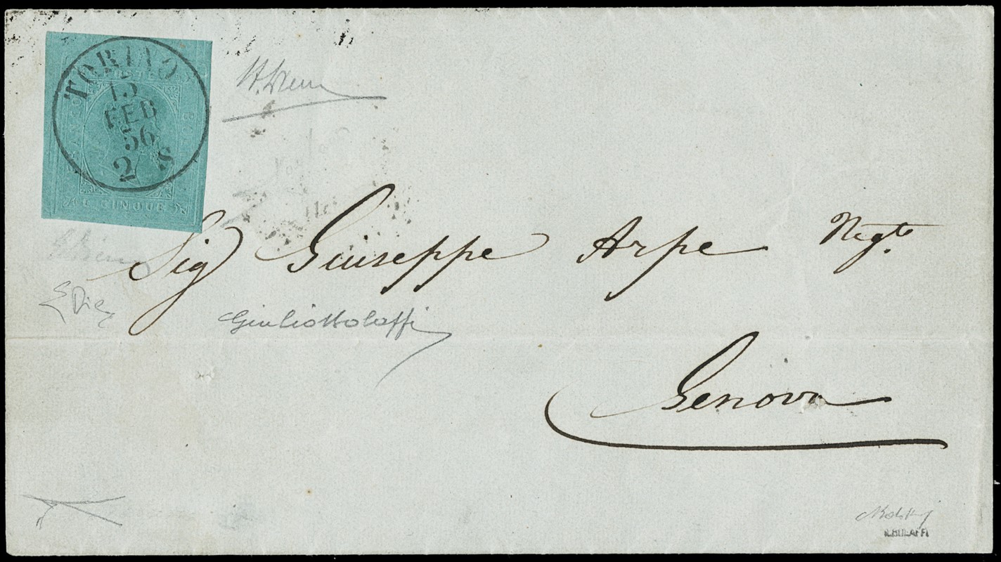 1853 - II emissione, 5c verde con doppia impressione e grandi margini, su circolare da 'TORINO 15 FEB 56' a Genova. Interessante uso tardivo, eccezionale qualita'. CF Giulio Bolaffi, Bottacchi ed E.Diena (Sassone 4a - Euro 26.250x2,5)